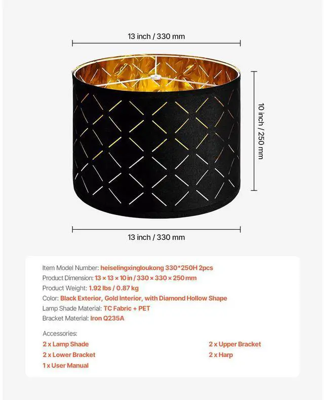 Product Dimension: 13 x 13 x 10 in / 330 x 330 x 250 mm, Color: Black Exterior, Gold Interior, with Diamond Hollow Shape, Item