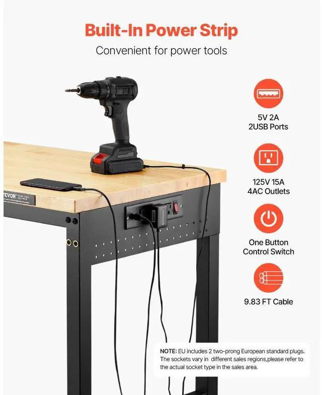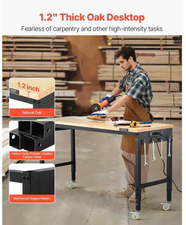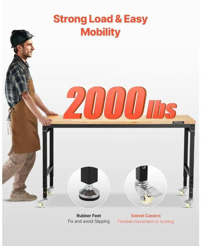 VEVOR 60" Workbench on Wheels Adjustable Height Table with Power Outlet & Pegboard 60" Heavy-duty Workbench Easy Mobility Adjustable Height Easy Storage & Power Access Wide Application Simple Assembly