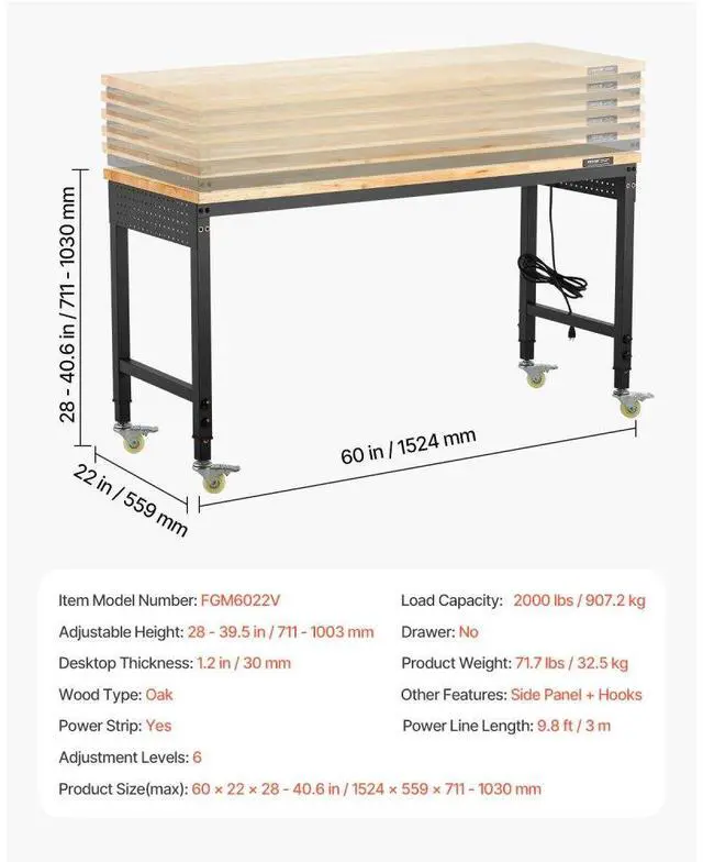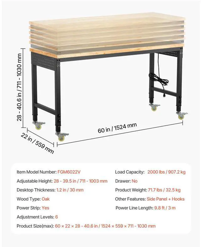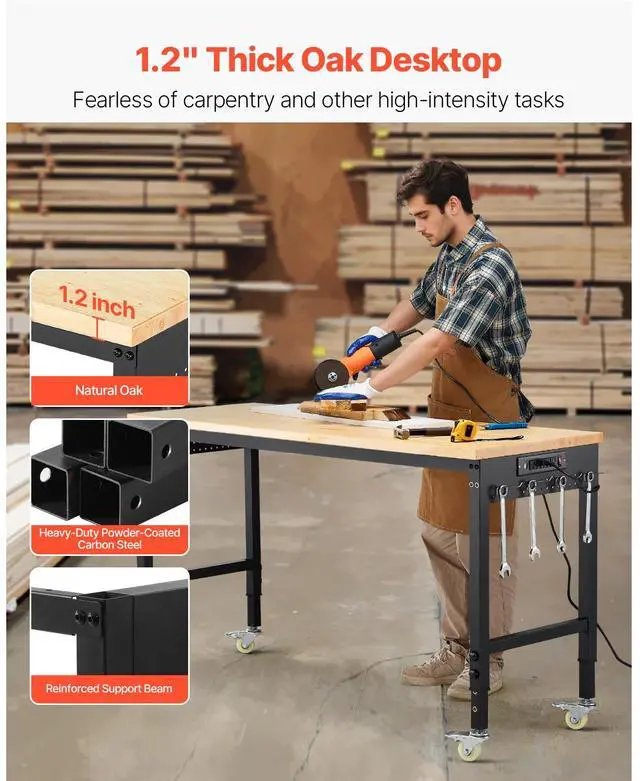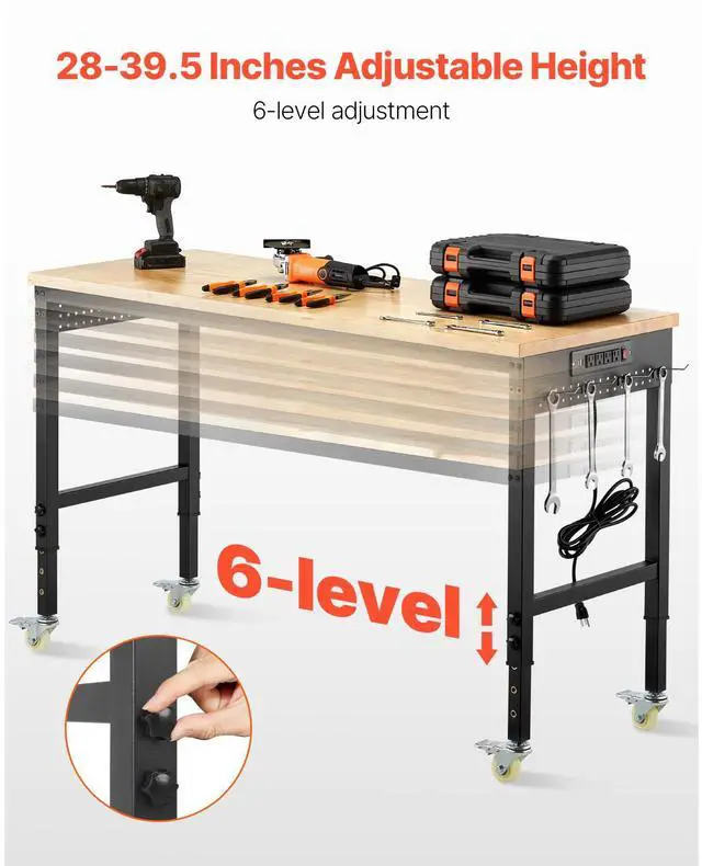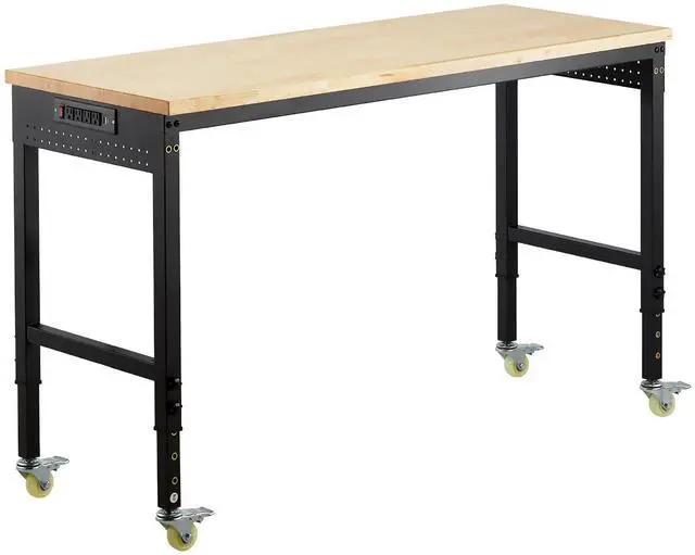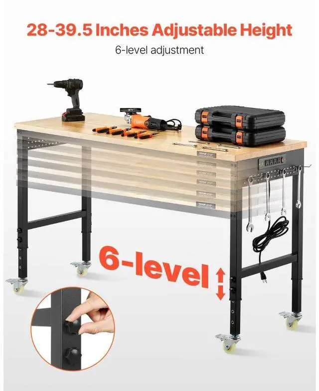 • VEVOR 60" Workbench on Wheels Adjustable Height Table with Power Outlet & Pegboard