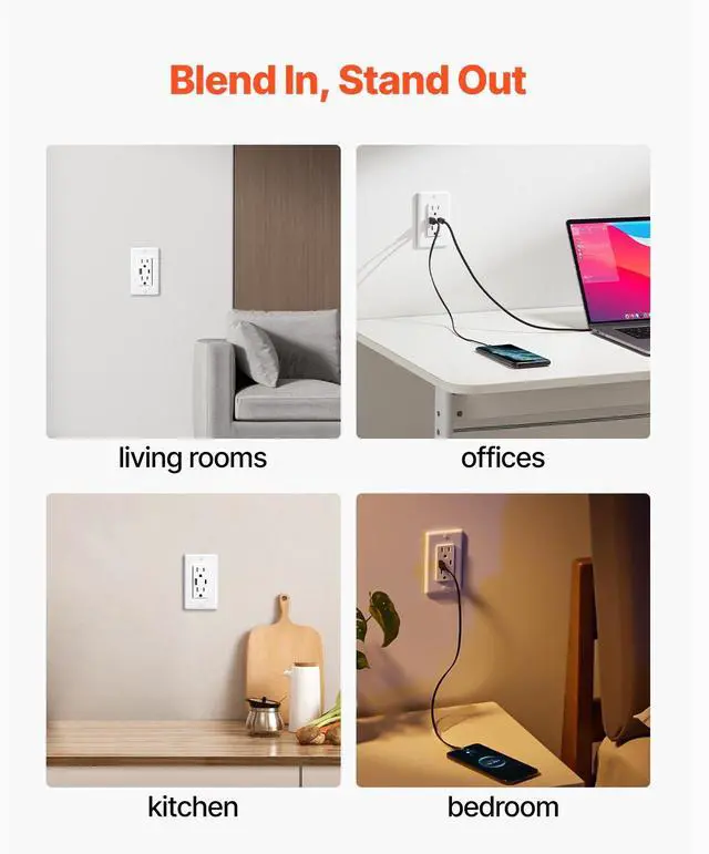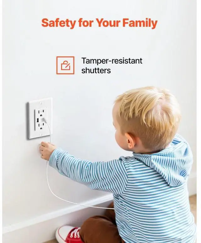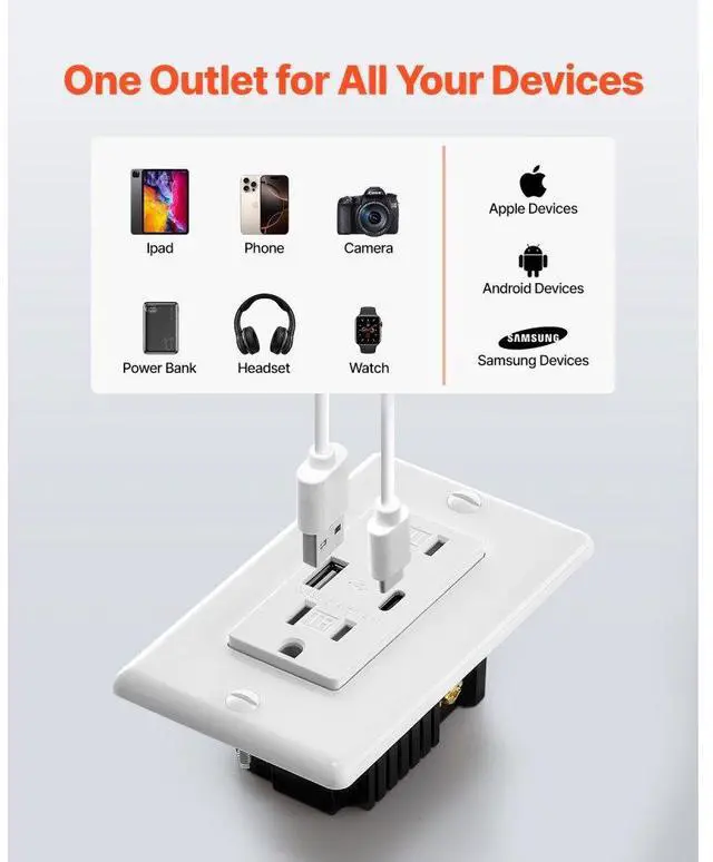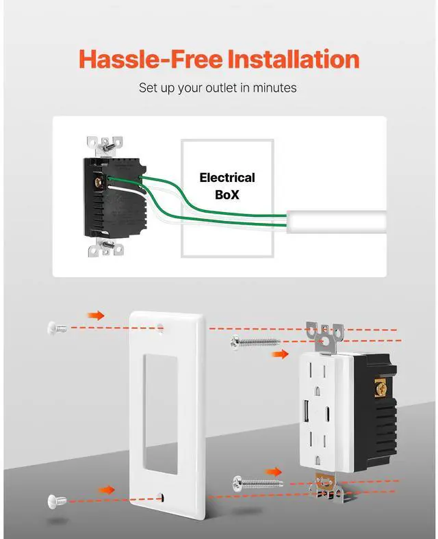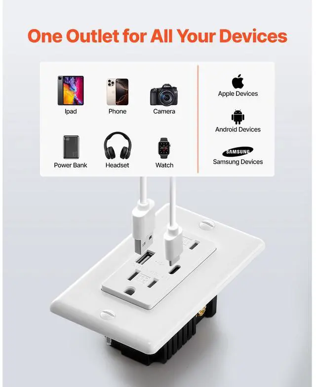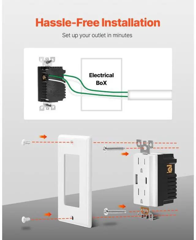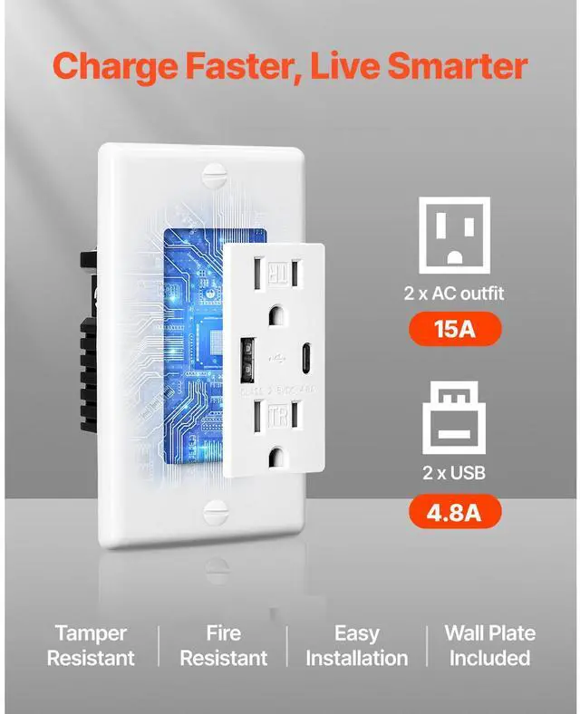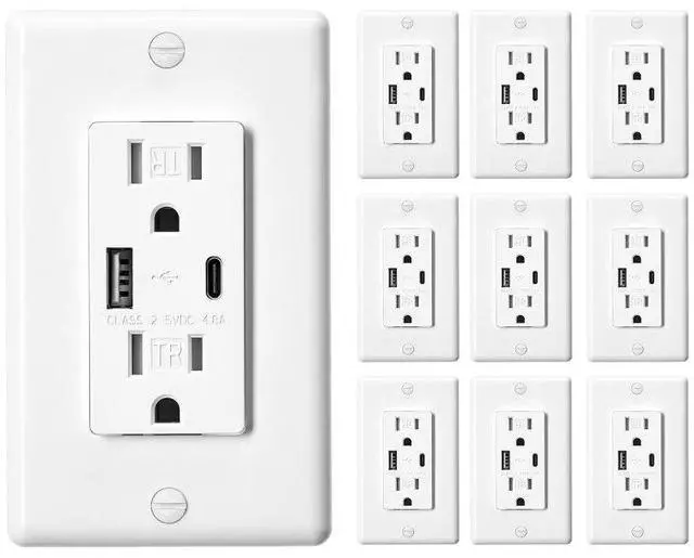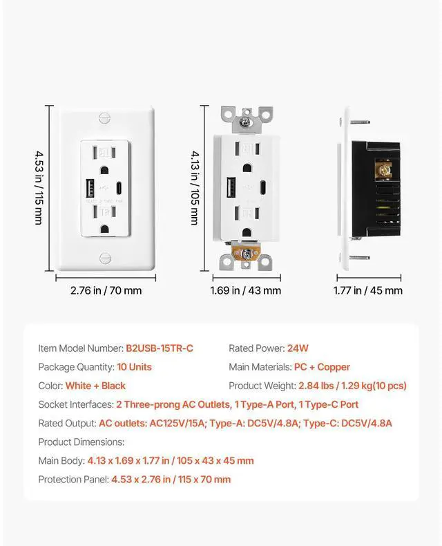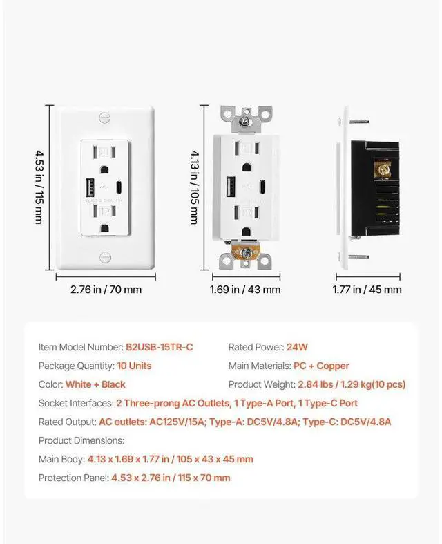 VEVOR 10 PCS USB Outlet 24 W 15A Wall Electrical Outlet with 1 Type C & 1 Type A Ports Fast Charging Power Anytime, Anywhere 24W Power Output Space-saving Easy Installation Optimized Charging