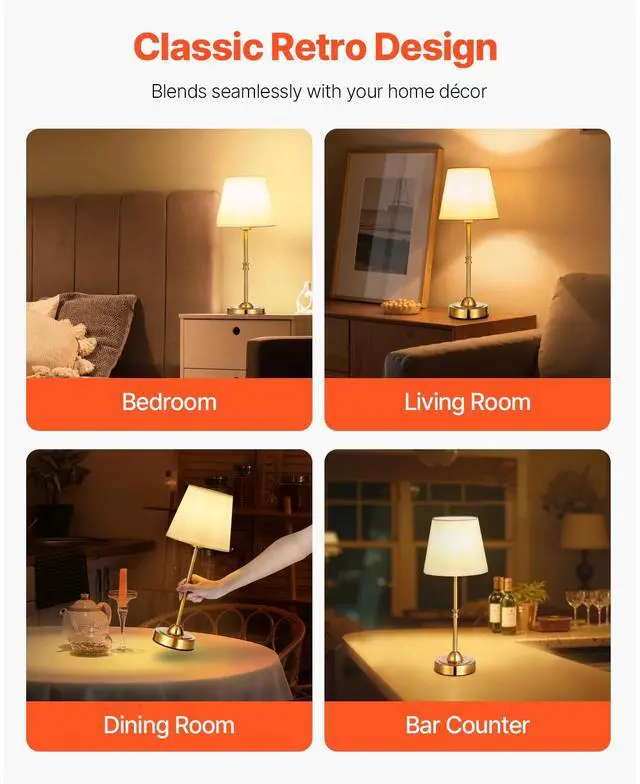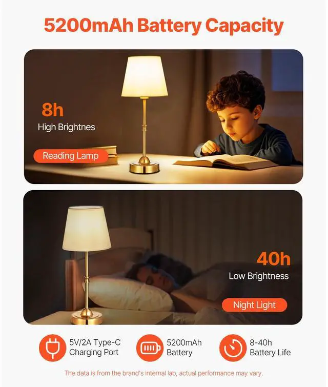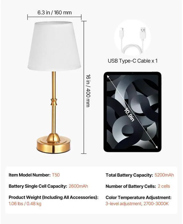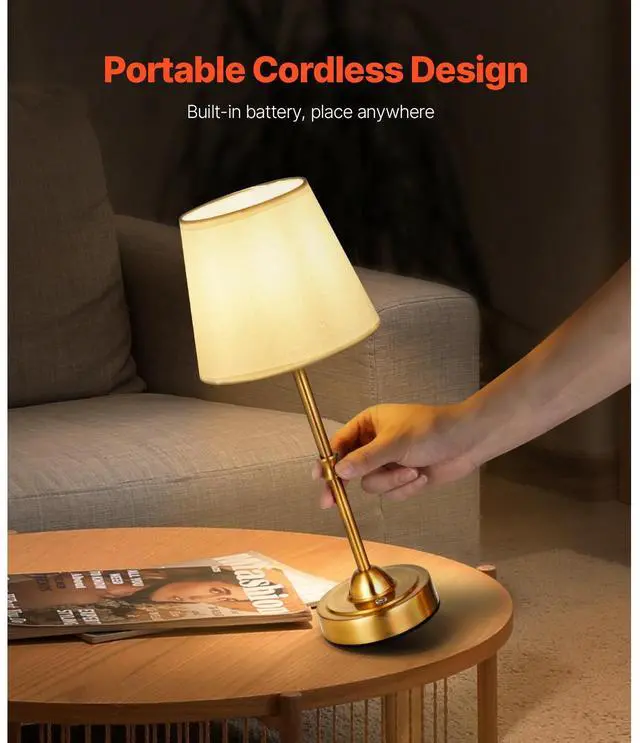 Cordless Table Lamp 5200mAh Rechargeable Battery Desk Lamp Fabric Shade Gold Fabric Shade Electroplated Finish Sturdy Base Large Capacity Battery Versatile Use 2700-3000K