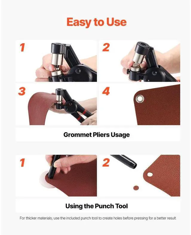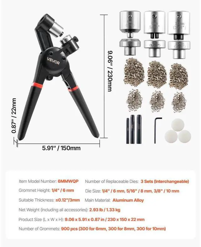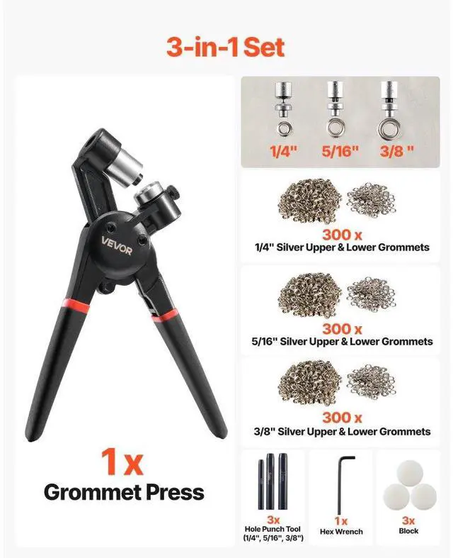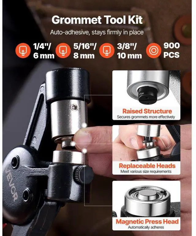 Grommet Tool Kit 900 PCS 1/4 Inch 5/16 Inch 3/8 Inch Metal Eyelets Grommets Simple to Use Strong Magnetic Grip Lightweight & Durable Easy Replacement Wide Applications Detailed User