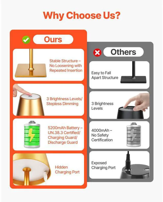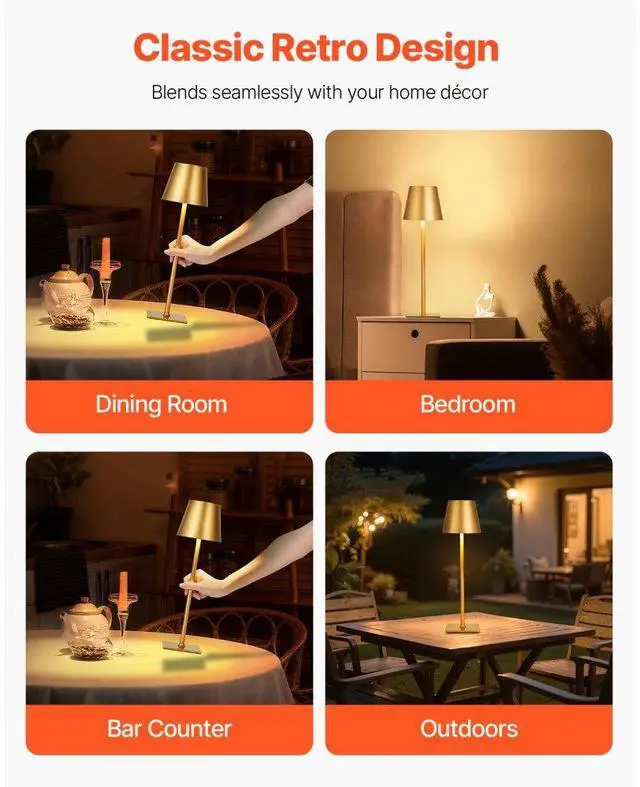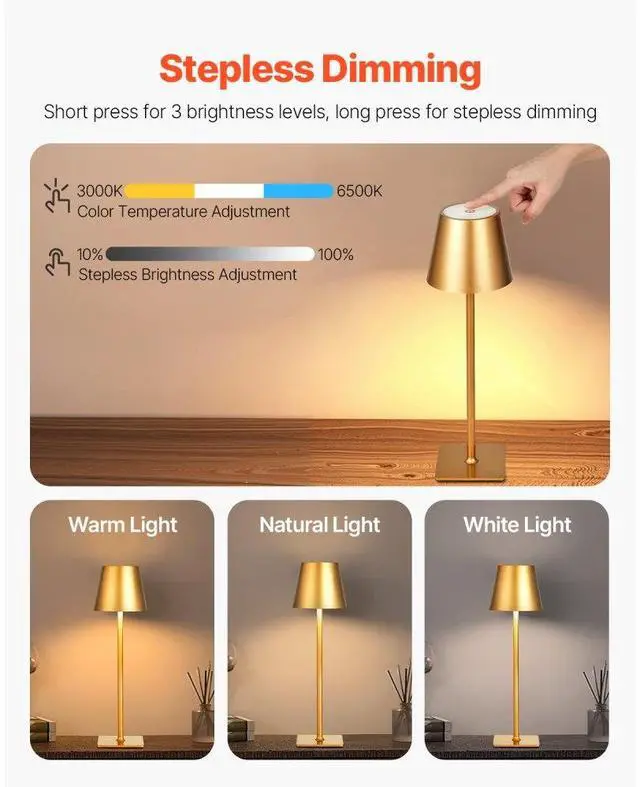Cordless Table Lamp 2-Pack 5200mAh Built-in Rechargeable Battery Desk Lamp Gold Stable Structure Touch Control Spray Coating Process Large Capacity Battery Versatile Use 3000-6500K