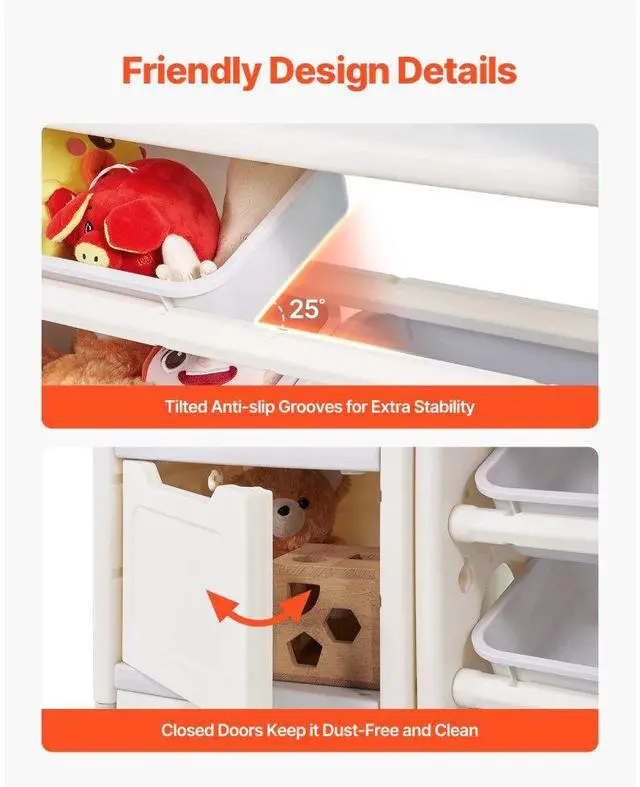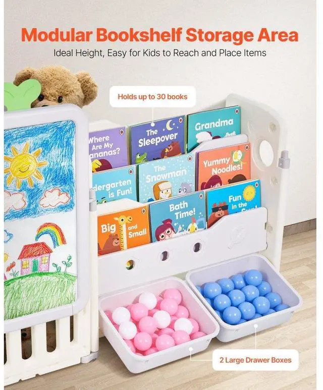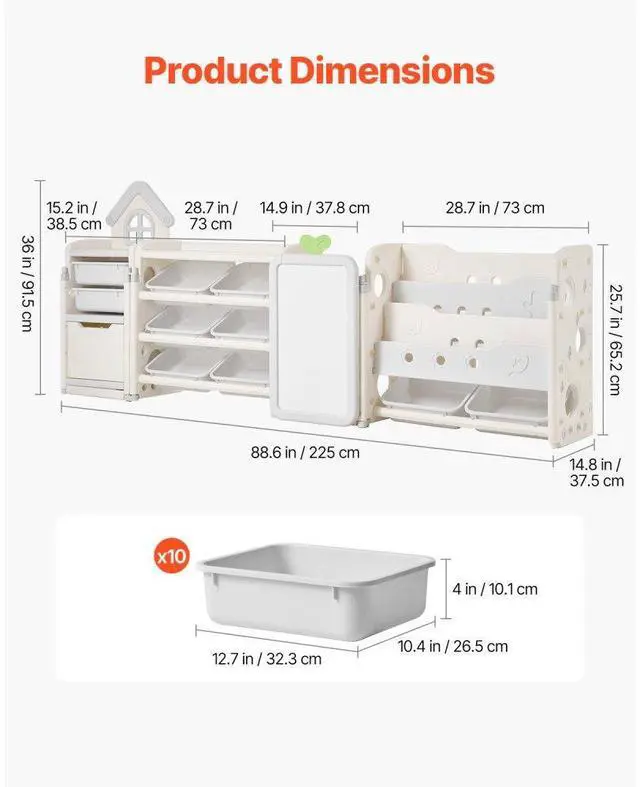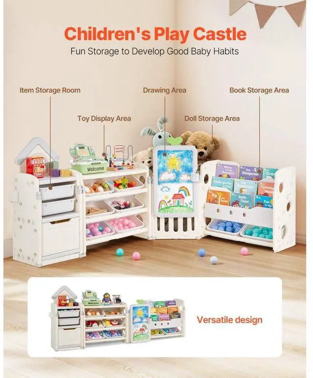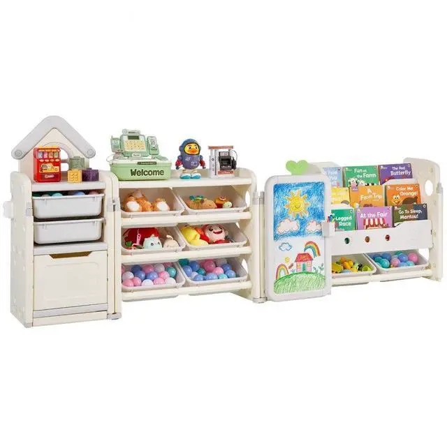 VEVOR Kids Toy Storage with Bookshelf, 4-Tier Large Toy Storage Organizer with 10 Plastic Movable Bins, Kids Cubby Cabinet with Bookshelf and Drawing Board for Study Room, Playroom, Classroom, Nursery Multi-Functional Storage Open Learning Area Large Capacity Storage Secure Materials Anti-Tip Security Great Present Ideal