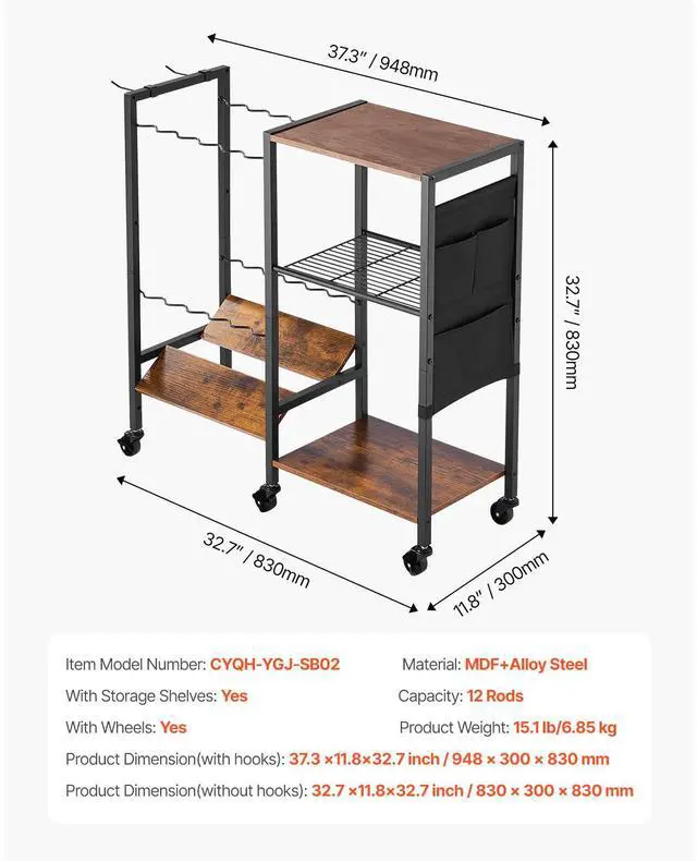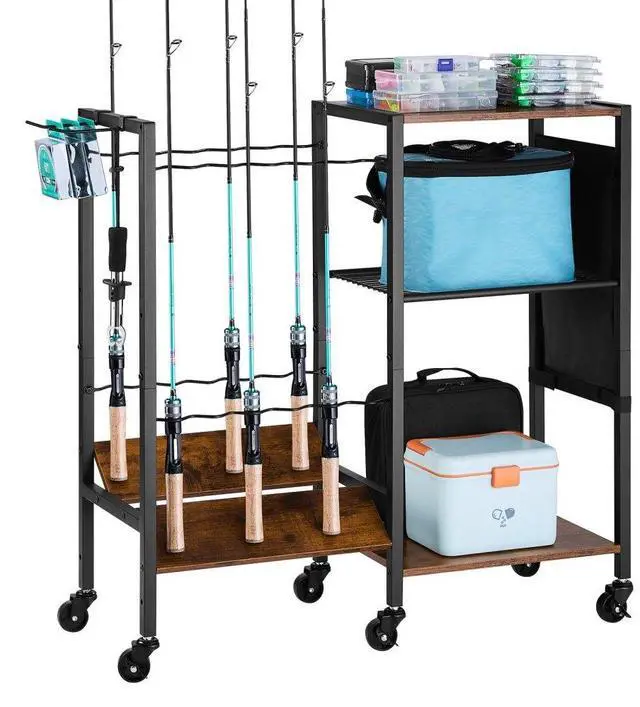 12 Pole Fishing Rod Holder Fishing Rack Cart Organizer with Wheels for Garage High-quality Material Large Storage Capacity Easy Mobility and Fixing Durability & Stability Widely Applicable Expandable Rubber Clips Capacity: 12 Rods, Item