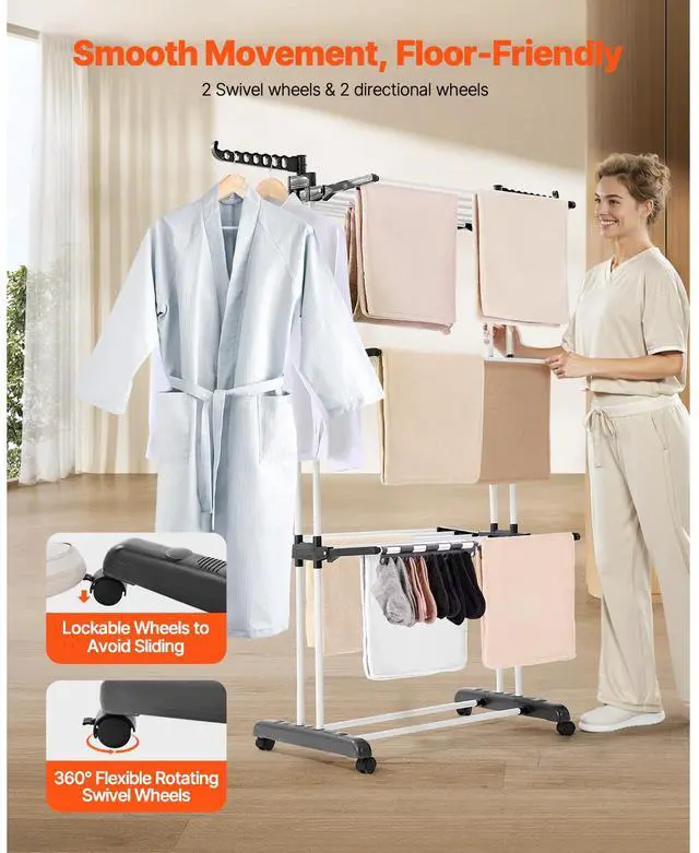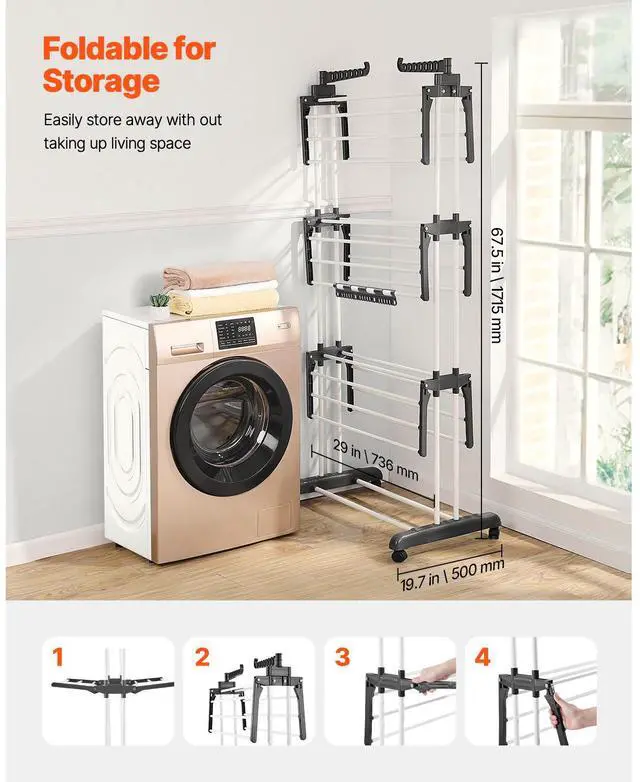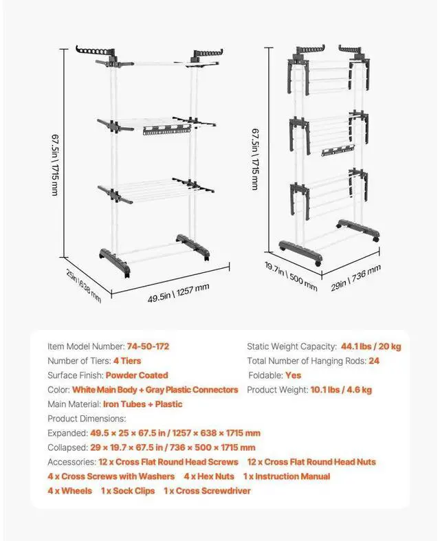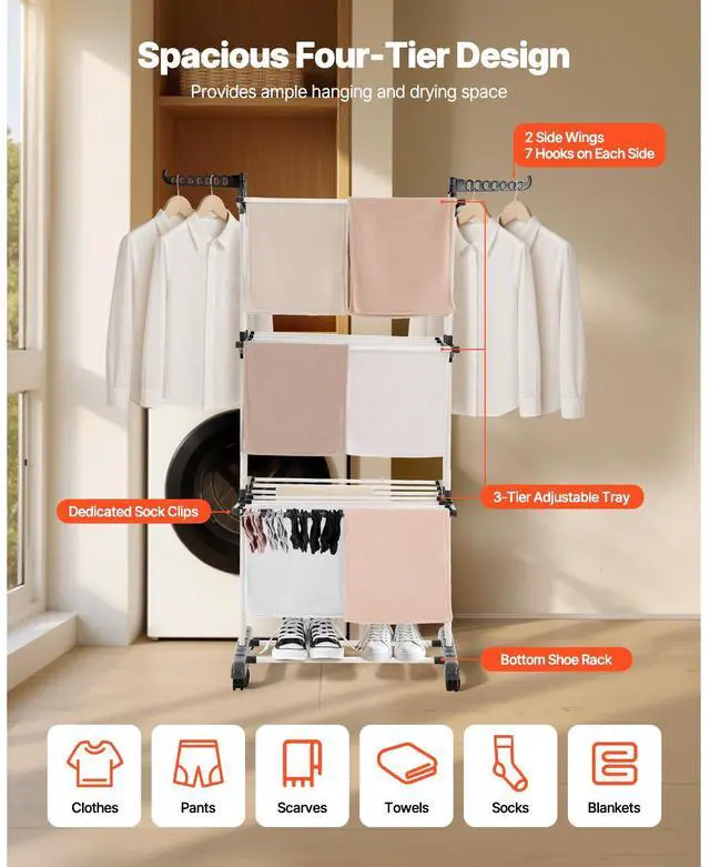 VEVOR Clothes Drying Rack, 4-Tier Foldable Laundry Dryer Rack, Metal Drying Racks with 24 Drying Rods, Free-Standing and Portable Hanger with 4 Castors and Two Side Wings for Outdoor & Indoor Use Foldable Drying Rack Heavy-Duty Support Efficient and Effortless Easy Installation Versatile Application Secure Packaging Number of