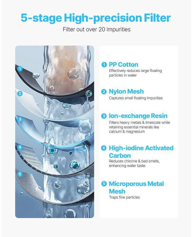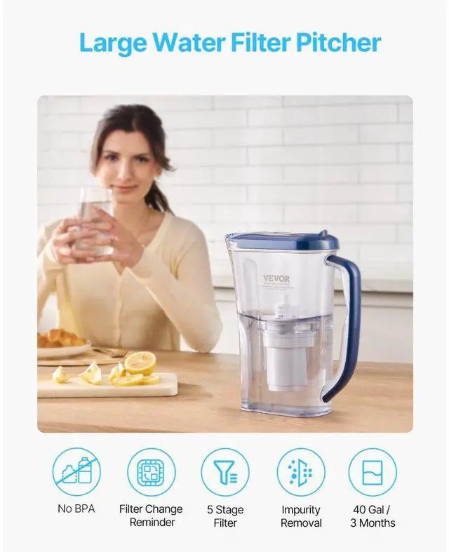 Water Filter Pitcher 9 Cup 5-stage Water Filter Dispenser 40 Gallons No BPA Drink with Confidence Enhanced Filtration, Better Flavor Convenient Filter Change Reminder High-precision Filtration Effortless Filter Replacement