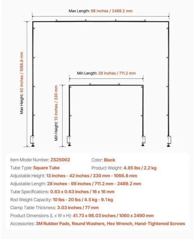 Adjustable Length: 28 inches - 98 inches / 711.2 mm - 2489.2 mm