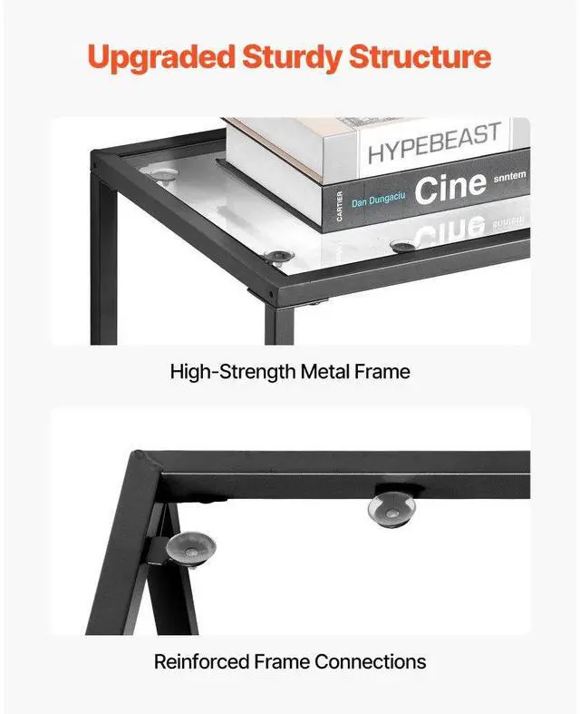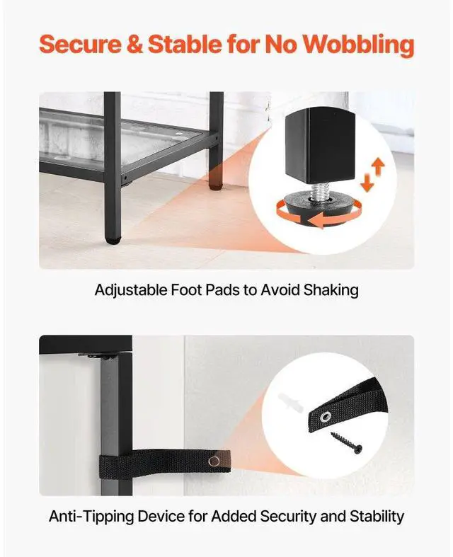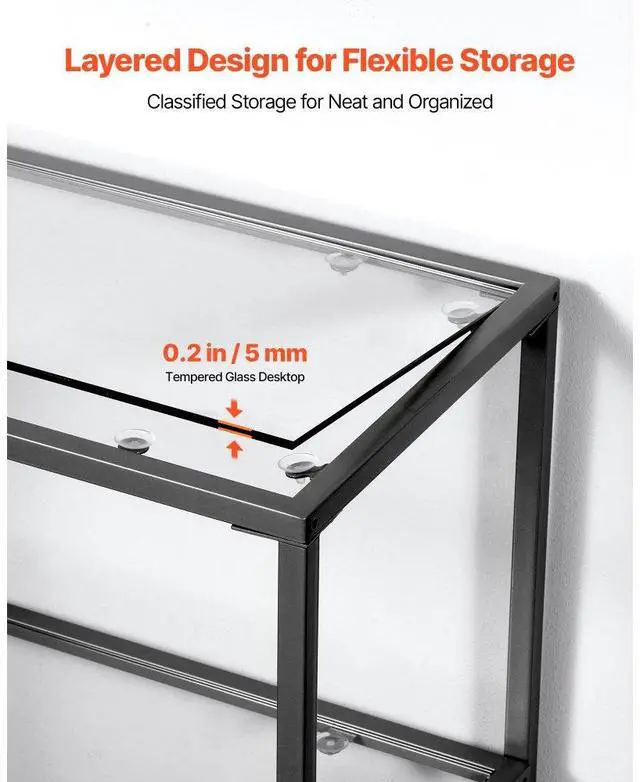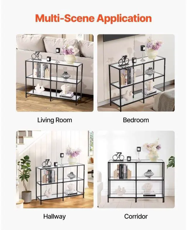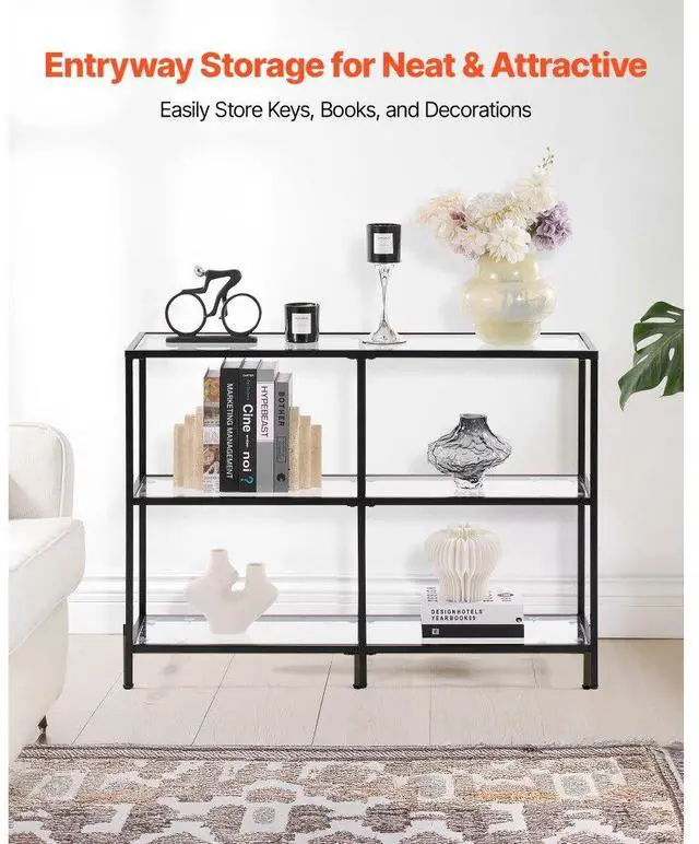 VEVOR 3-Tier Glass Console Table, Modern Rectangle Sofa Side Table with Tempered Glass Top and Iron Legs, Golden Consloe Desk with Anti-Tip Device for Living Room, Hallway, Entryway, Foyer, Black Maximized Storage Spacious Storage Sturdy Weight Support Security Upgraded Versatile Design Solid Metal Frame Number of