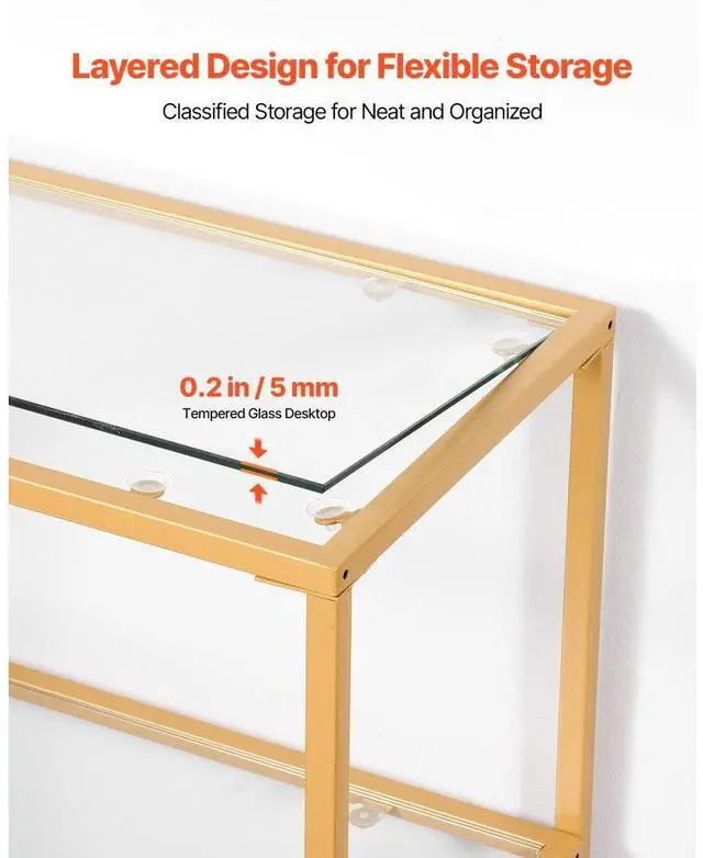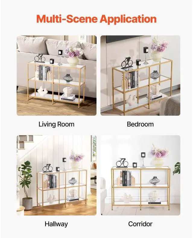 VEVOR 3-Tier Glass Console Table, Modern Rectangle Sofa Side Table with Tempered Glass Top and Iron Legs, Golden Consloe Desk with Anti-Tip Device for Living Room, Hallway, Entryway, Foyer, Golden Maximized Storage Spacious Storage Sturdy Weight Support Security Upgraded Versatile Design Solid Metal Frame Number of