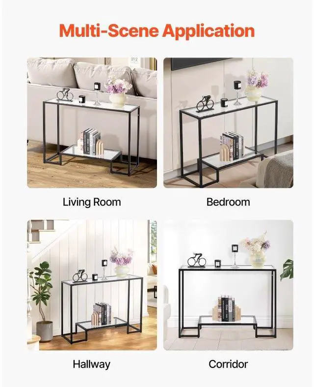 VEVOR 2-Tier Glass Console Table, Modern Rectangle Sofa Side Table with Tempered Glass Top and Iron Legs, Golden Consloe Desk with Anti-Tip Device for Living Room, Hallway, Entryway, Foyer, Black Maximized Storage Spacious Storage Sturdy Weight Support Security Upgraded Versatile Design Solid Metal Frame Number of