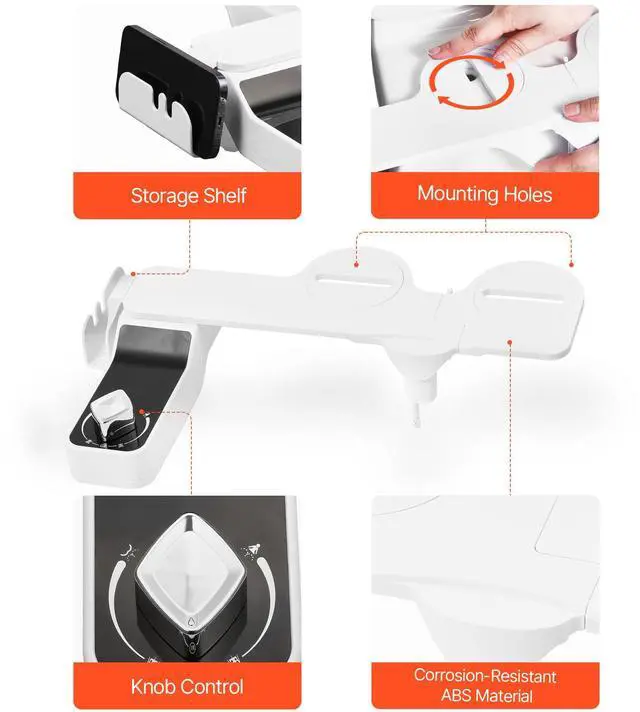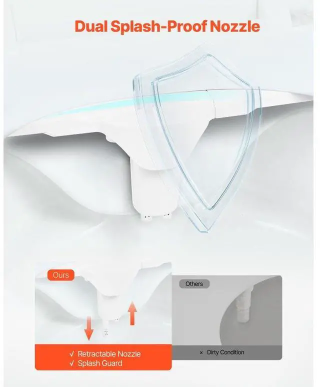 • Retractable Nozzle: The toilet bidet attachment features a retractable nozzle and a splash guard. The nozzle automatically returns behind the splash guard when not in use, keeping it clean and preventing splash-back or dirt.