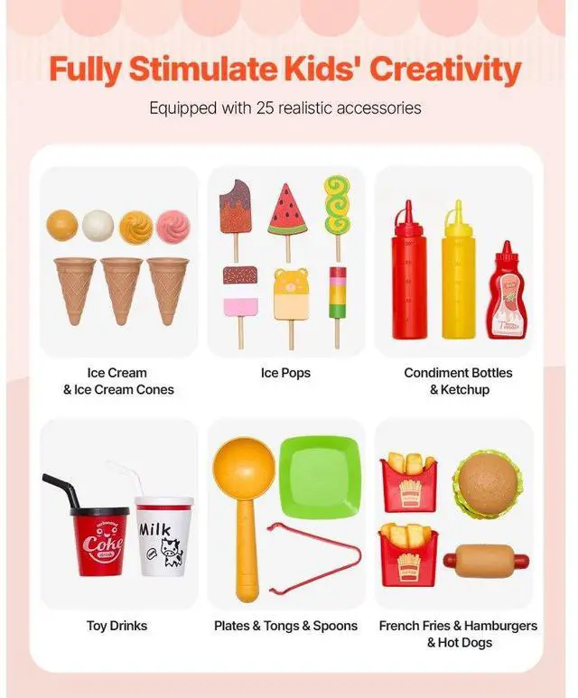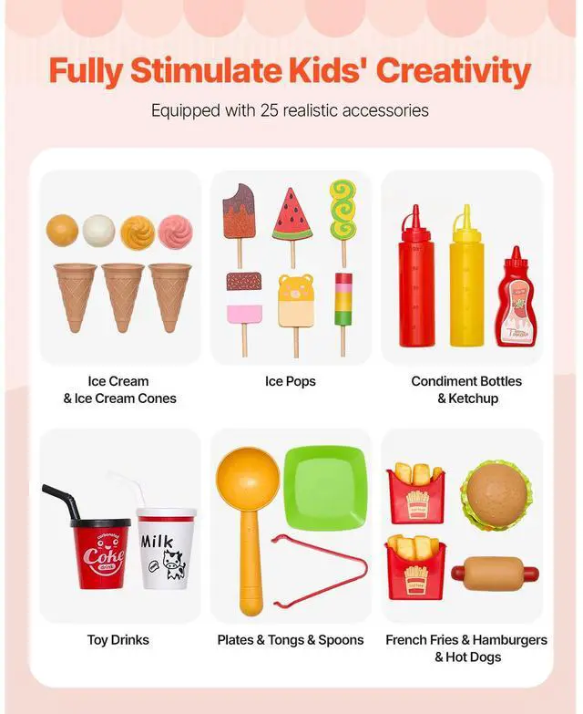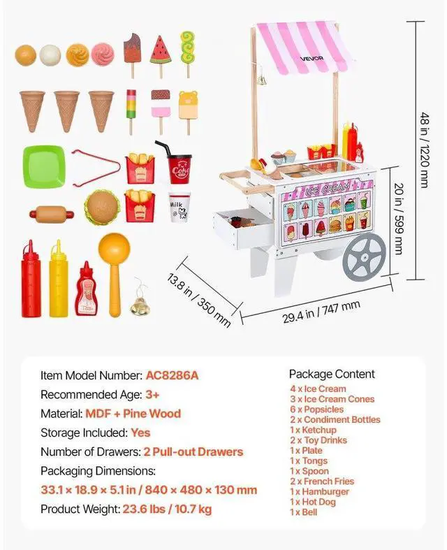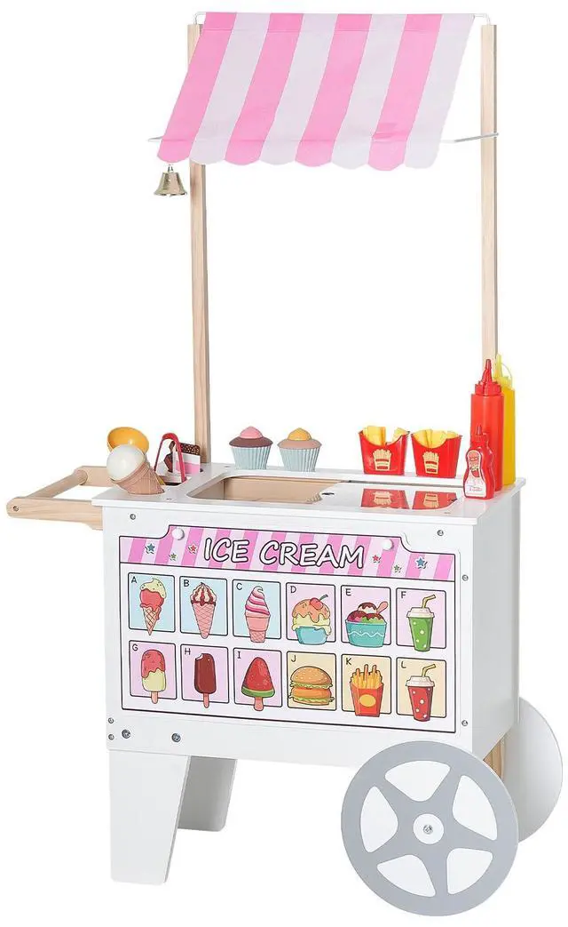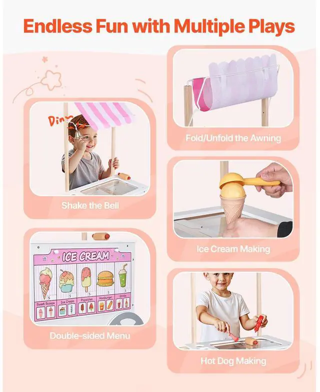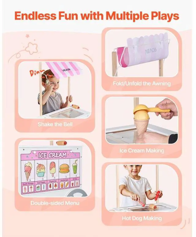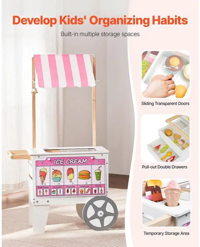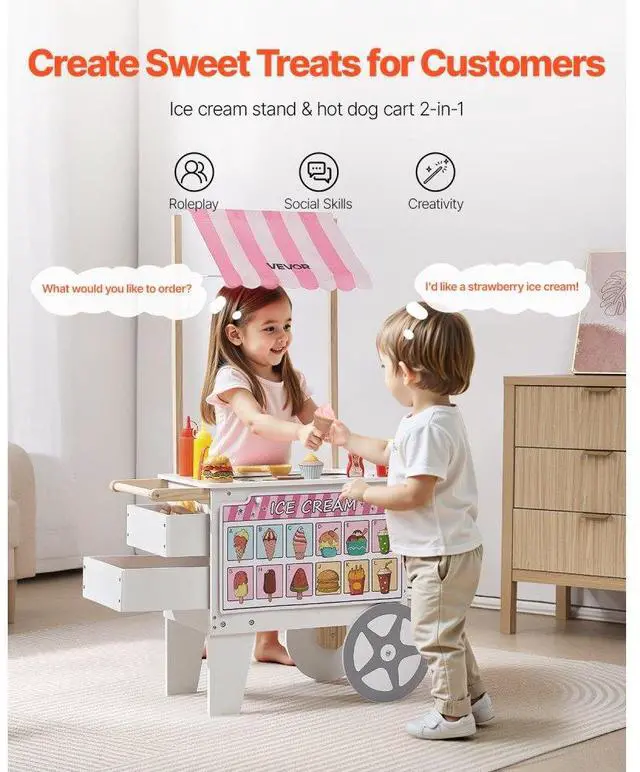 VEVOR Ice Cream Cart for Kids Pretend Play Ice Cream Shop for Kids Aged 3-7 Two-in-one Fun Two Modes, One Toy Endless Play Possibilities Secure Wooden Structure Ideal Educational Gift Easy to Push
