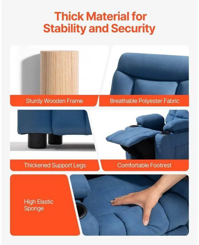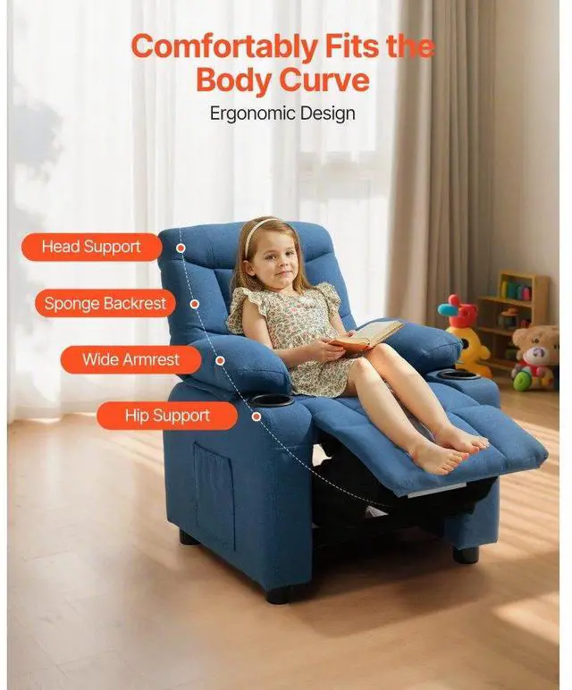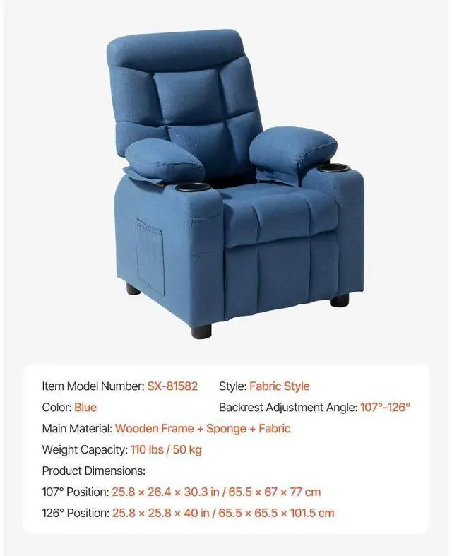 VEVOR Kids Reclining Chair, Toddler Recliner with Cup Holders and Pockets, 107° to 126° Adjustable Backrest, Breathable Polyester Fabric Recliner Couch with Footrest, for Boys & Girls, Children (Blue) Children's Recliner Reliable Materials Comfortable Sitting Convenient Storage Versatile Use Easy Assembly 126°