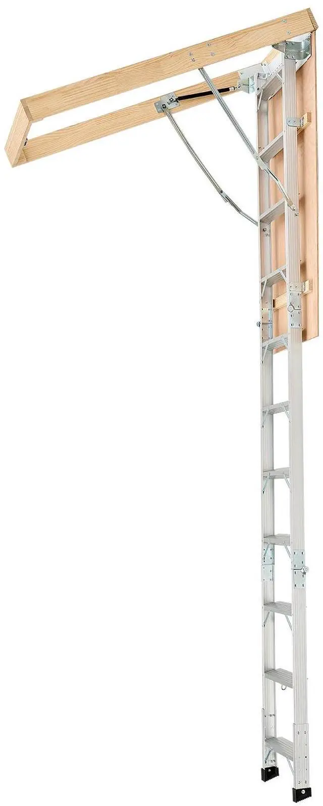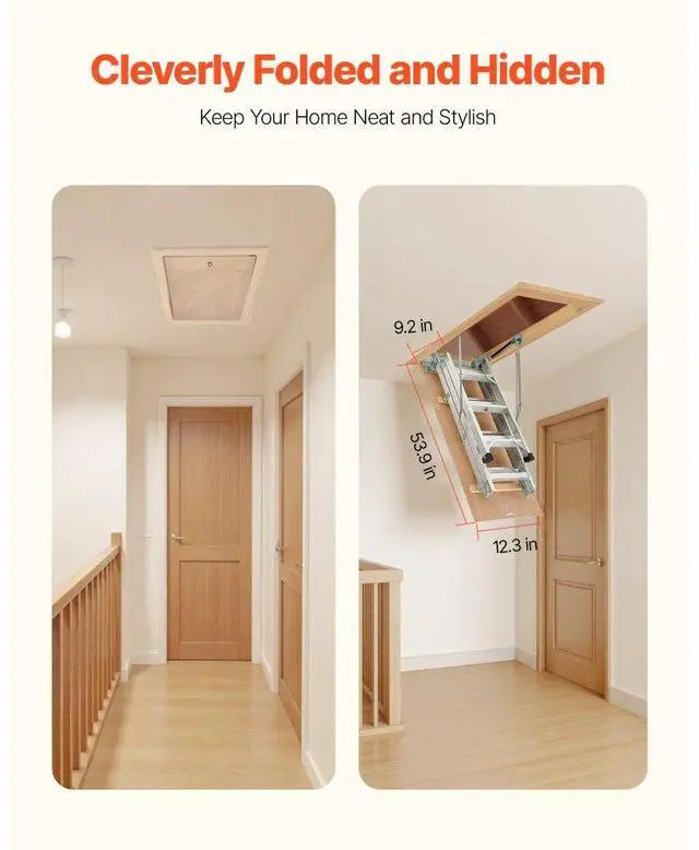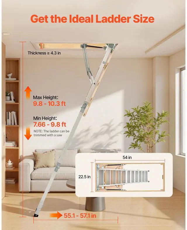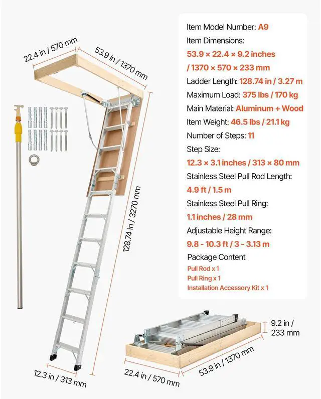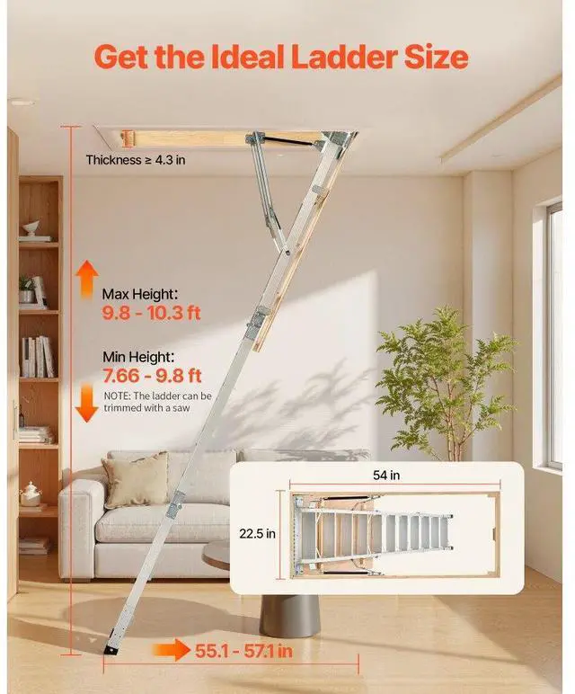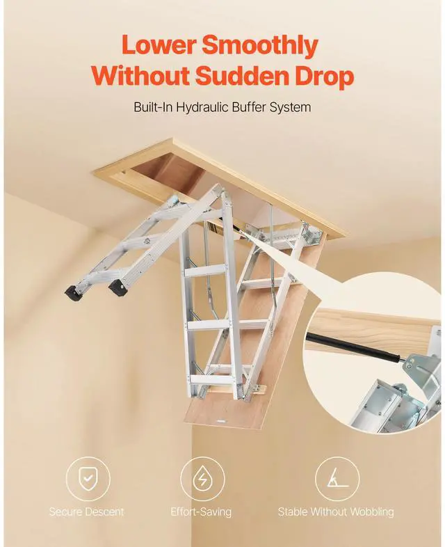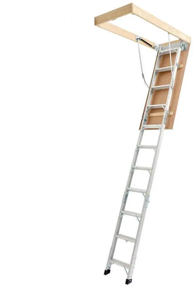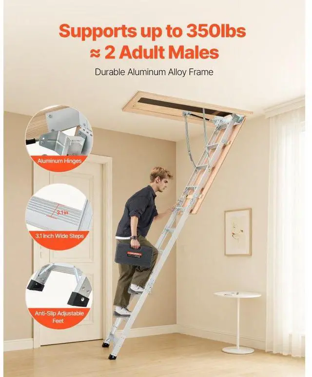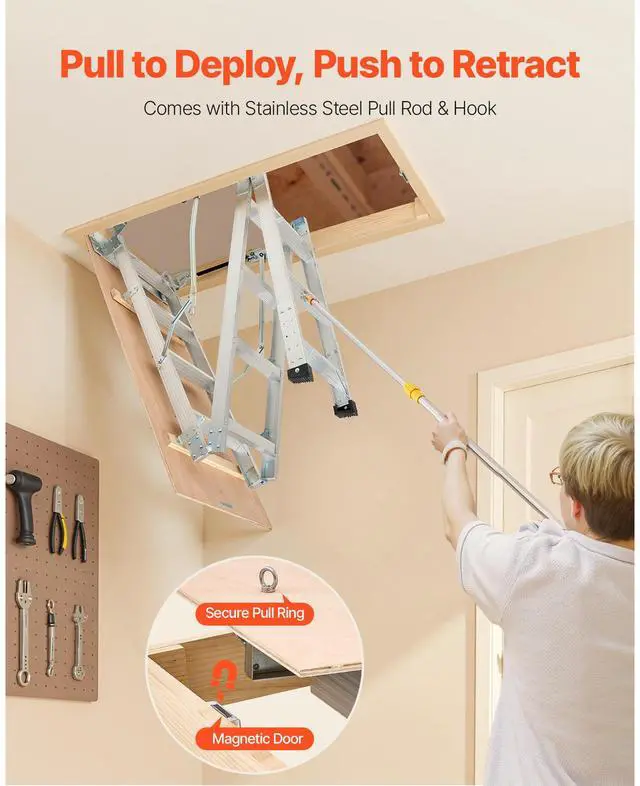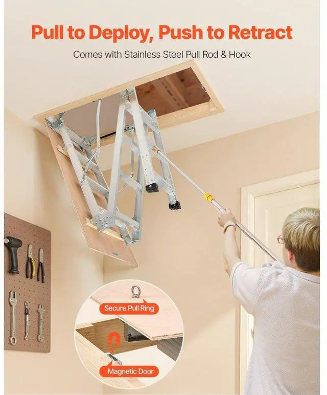 Attic Ladder 375LBS / 170KG Capacity for 7.66 to 10.25 ft Ceilings Aluminum Non-Slip Rubber Foot Pads, No Floor Damage Ergonomic Handrails for Secure Climbing Durable Stainless Steel Pull Rod & Pull Ring Wide Applications Anti-Slip Foot Pad Base Magnetic Closure for a Seamless Look Stainless Steel Pull Ring: 1.1 inches / 28 mm, Maximum