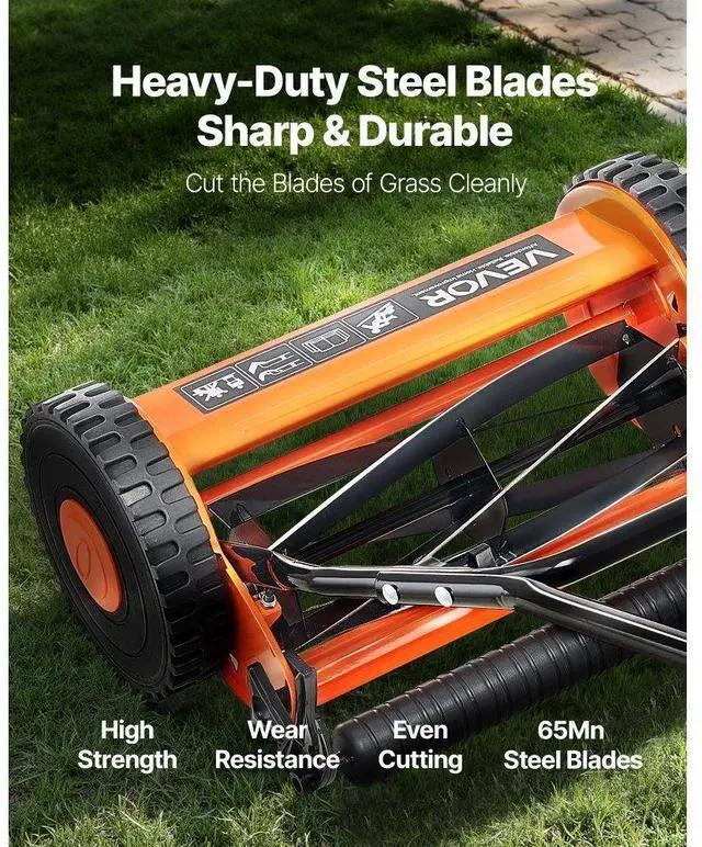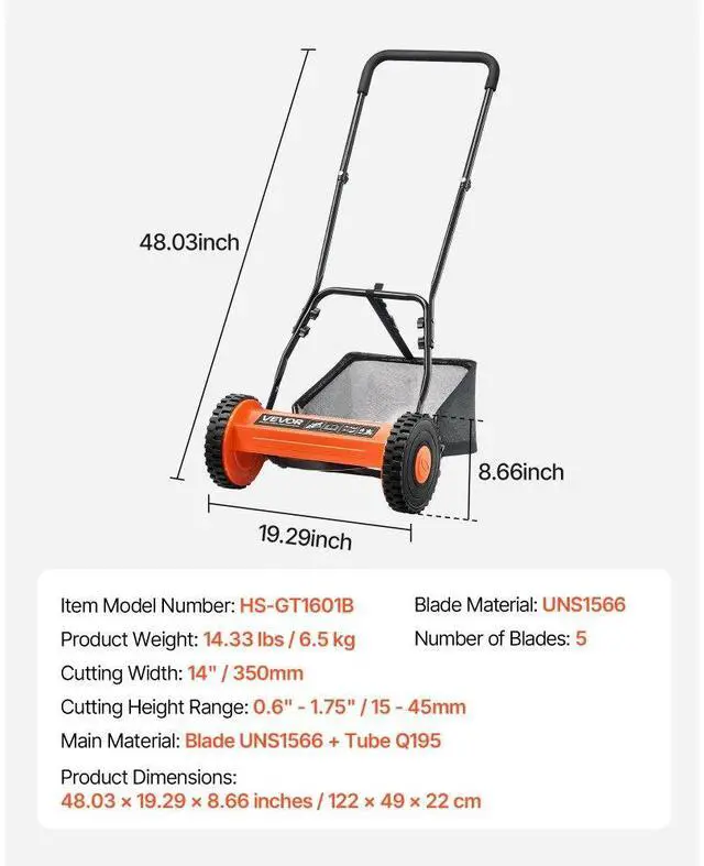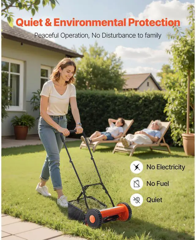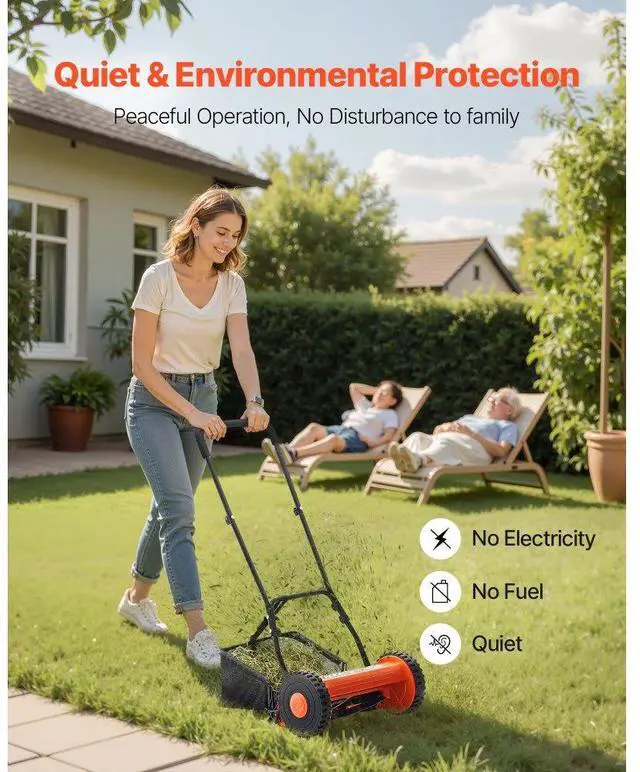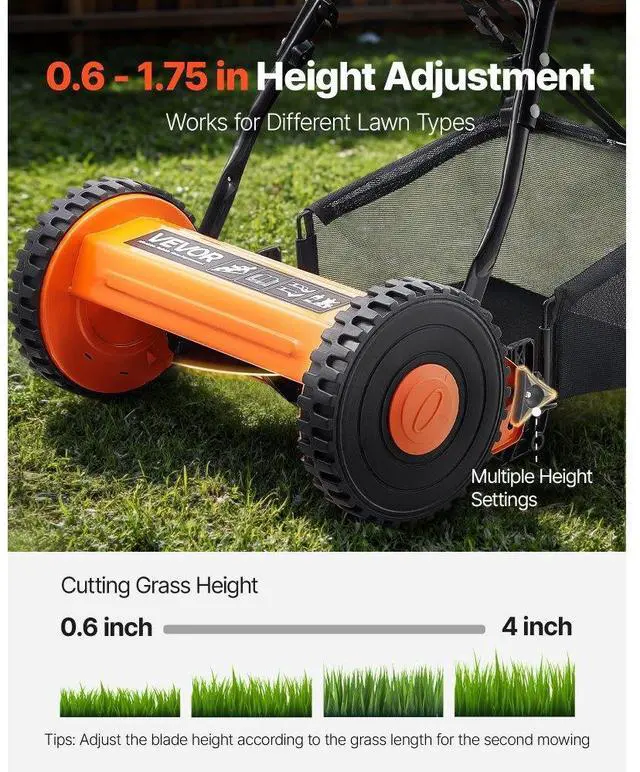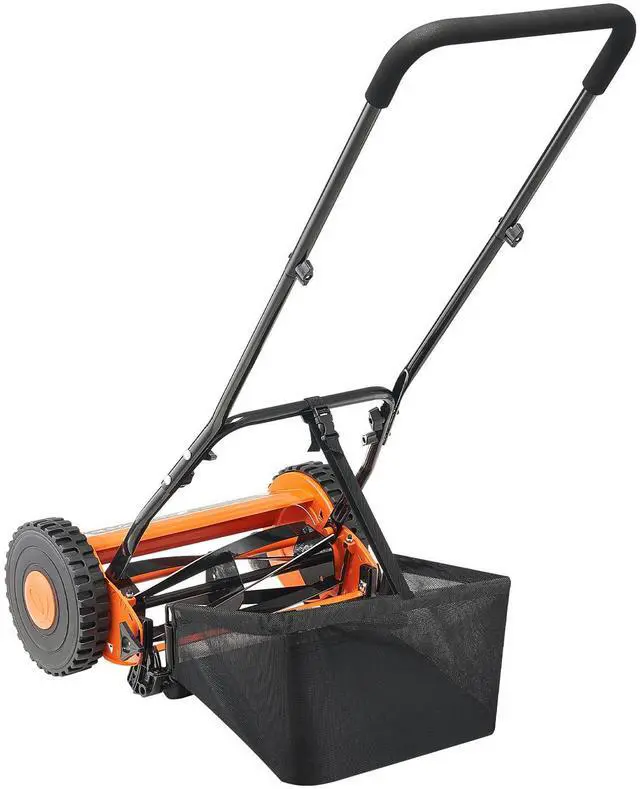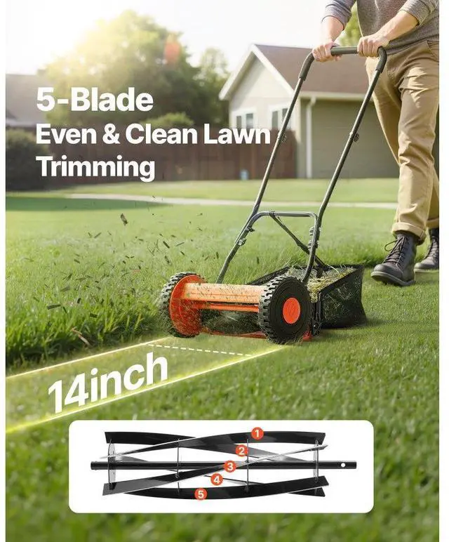 14" Manual Push Reel Lawn Mower 5-Blade Adjustable Height Grass Catcher 2 Wheels Large Wheels U-Shaped Handle Grass Catcher Bag Quick Assembly Versatile Use Environment Protection & Silent