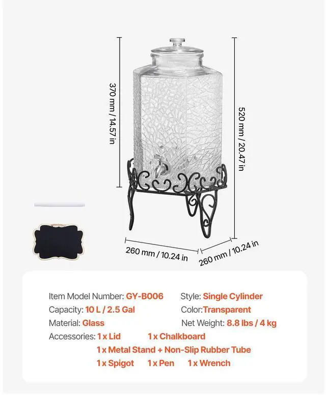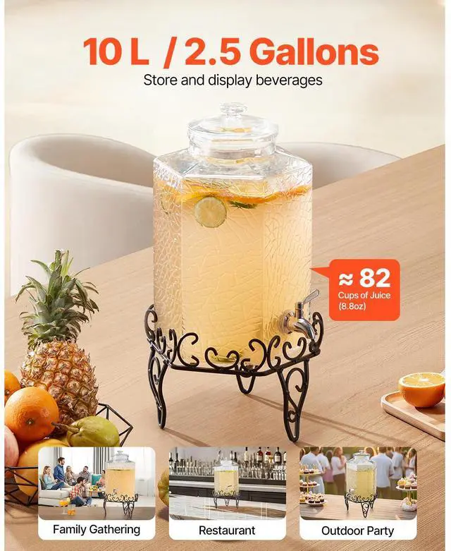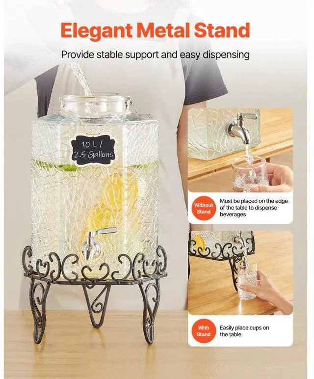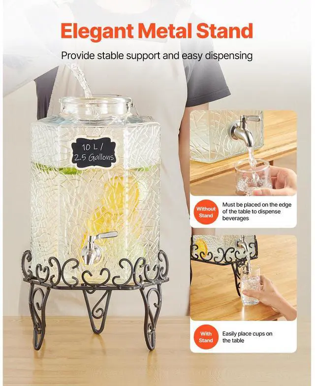 • Drink Dispenser 2.5 Gal Beverage Dispenser for Parties Glass with Stand