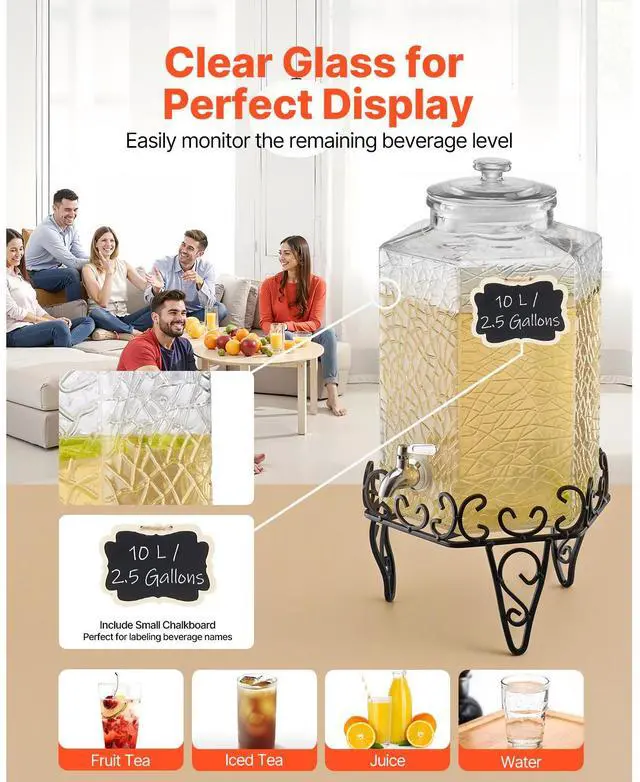Drink Dispenser 2.5 Gal Beverage Dispenser for Parties Glass with Stand Continuous Beverage Supply No Drip Spigot BPA-Free More Thoughtful