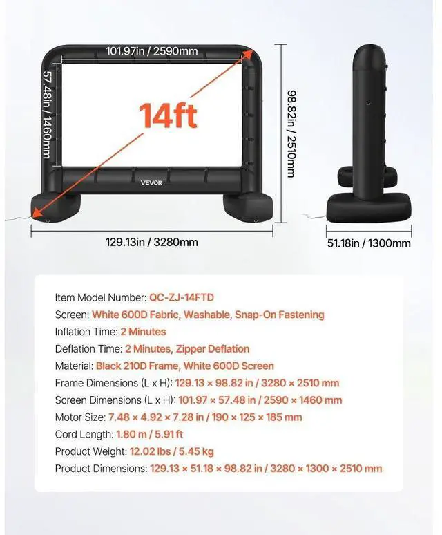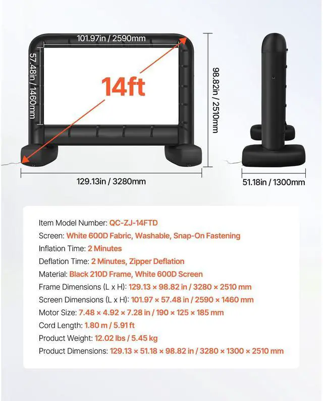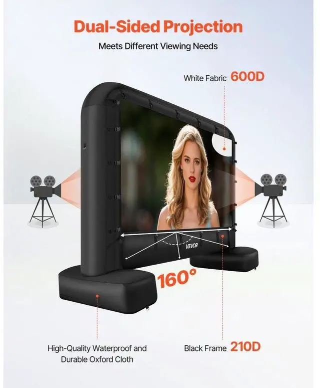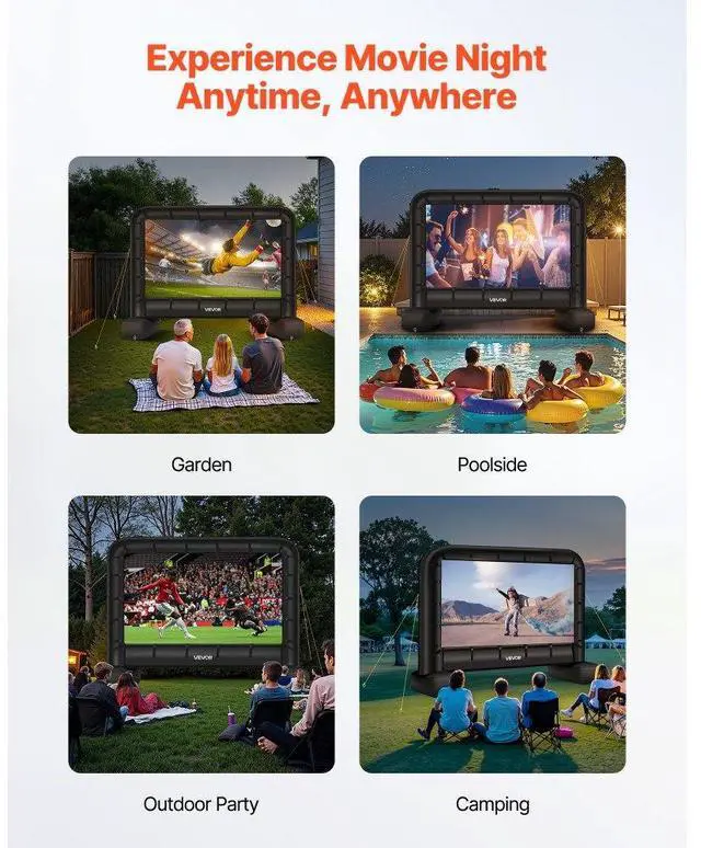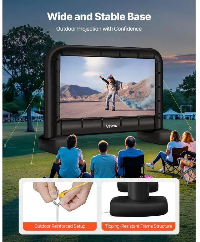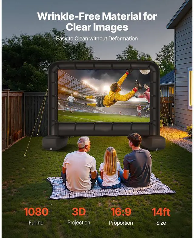 VEVOR 14 ft Inflatable Movie Screen 16:9 600D Movie Projection with Portable Bag Wrinkle-Free Material Wide Viewing Angle Stable Frame Quick Setup Lightweight & Portable Silent Blower Inflation Time: 2 Minutes,