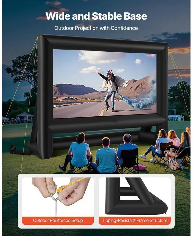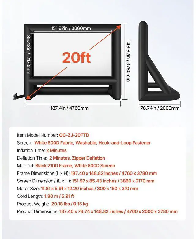 VEVOR 20FT Inflatable Movie Screen, Inflatable Projector Screen with Portable Storage Bag, 16:9 Easy Set Up Movie Projection for Outdoor Backyard, Home Theater, Theme Party Wrinkle-Free Material Wide Viewing Angle Stable Frame Quick Setup Lightweight & Portable Silent Blower Inflation Time: 2 Minutes,
