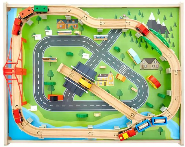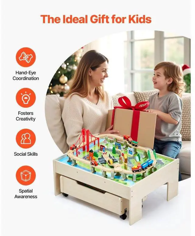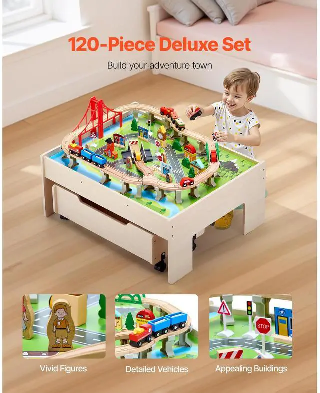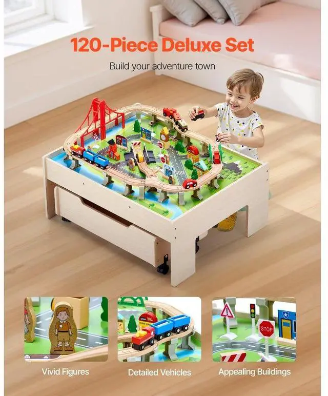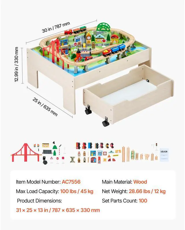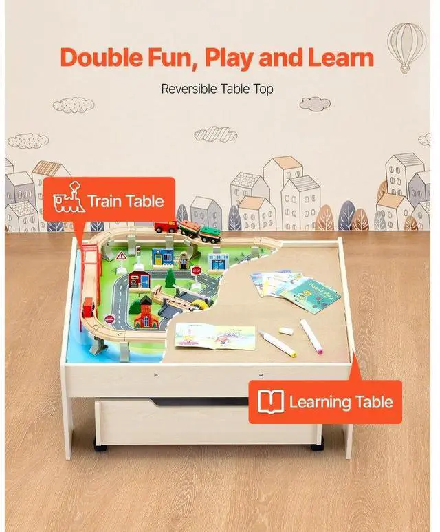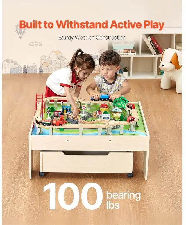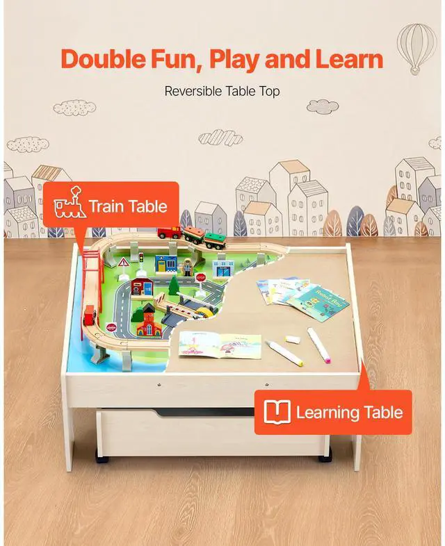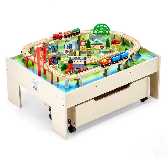 Train Table 100 Pieces Wooden Kids Activity Table with Rolling Storage Drawer Town Theme Set 3-in-1 Multifunctional Table Interactive Play Thoughtful Design Ideal Gift Comprehensive Installation Guide Set