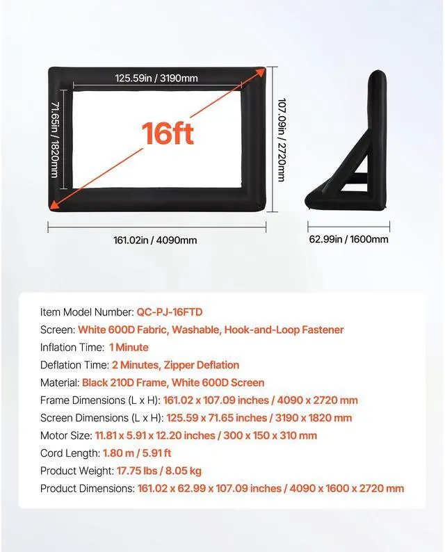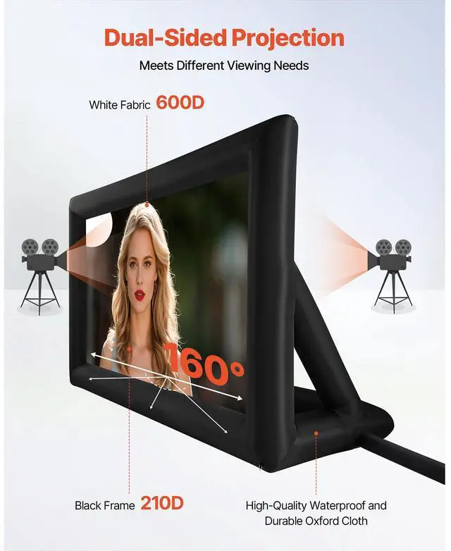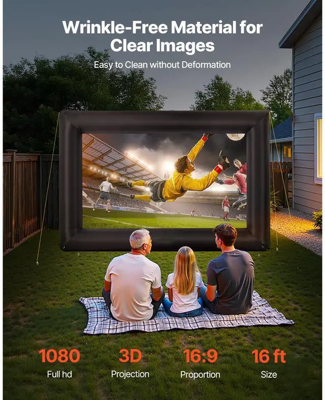 VEVOR 16FT Inflatable Projector Screen, Inflatable Movie Screen Outdoor with 250W Air Blower Projector Screen Oxford Fabric Material Blow Up Screen for Outdoor Backyard, Home Theater, Theme Party Wrinkle-Free Material Wide Viewing Angle Stable Frame Quick Setup Lightweight & Portable Silent Blower Inflation Time: 1 Minute,