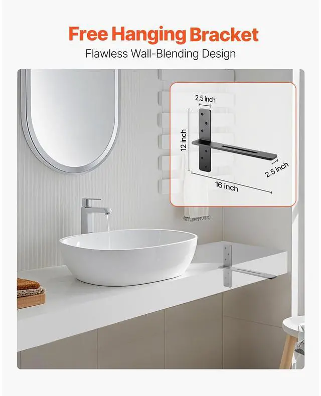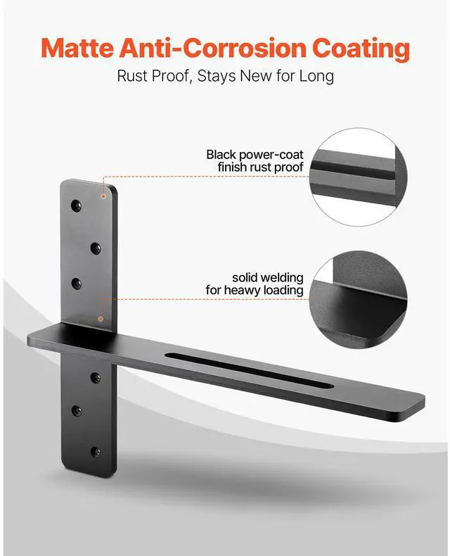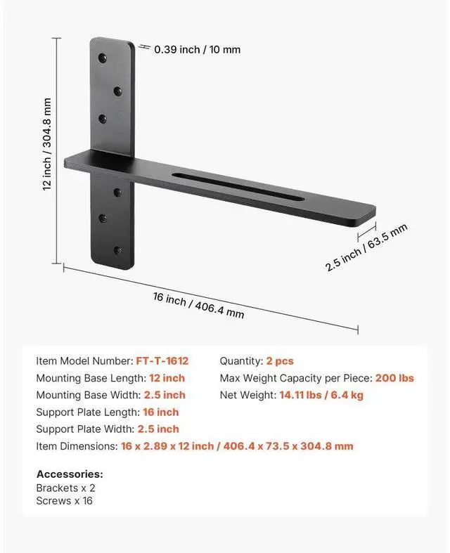 2 Pcs Shelf Brackets 16 inch / 406.4 mm Heavy Duty Floating Shelf Brackets T-Shaped Floating Shelf Brackets Durable Steel Build Strong Versatility Multiple Size Options Quick 3-Step Installation Various Mounting Methods