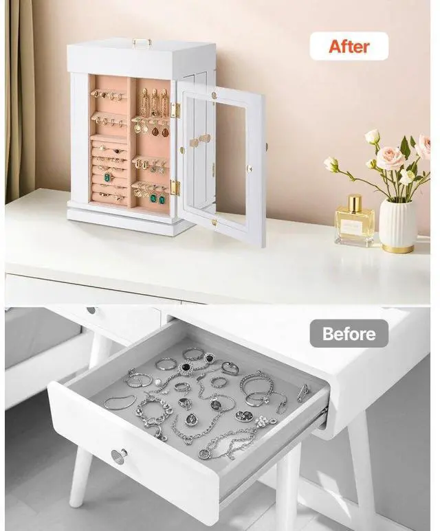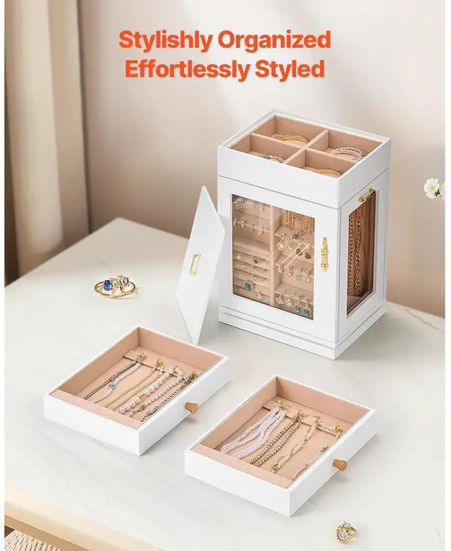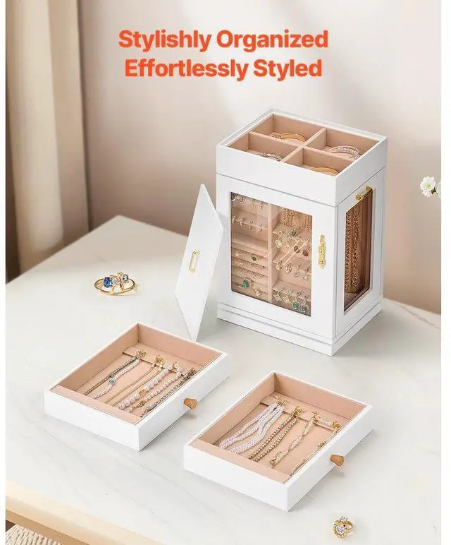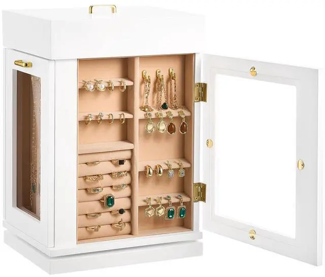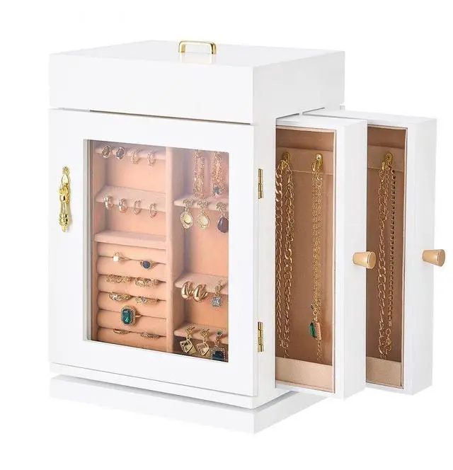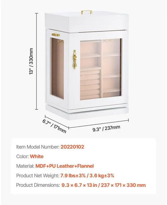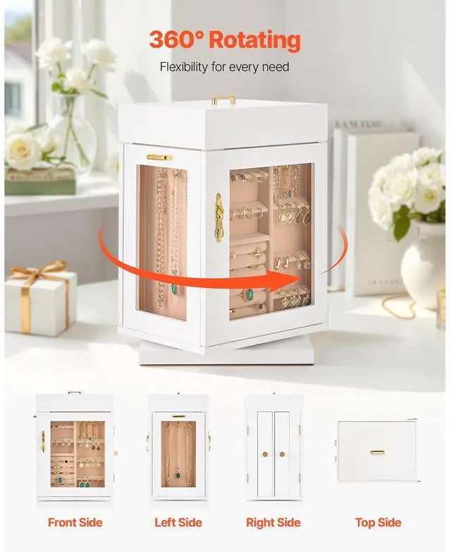 Jewelry Box 360° Rotating Jewelry Organizer with Built-in 4 Necklace Hooks White Layered Design for Easier Storage Seamless Magnetic Closure 360° Flexible Storage Vertical Drawers with 4 Necklace Hooks Crafted for Elegance & Longevity Ideal Gift Color: White, Item