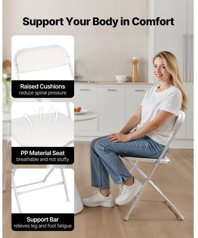 VEVOR 4 Pack Folding Chairs, Foldable Plastic Chairs with Heavy Duty Metal Frame, Portable Folding Card Table Chairs, Stackable Indoor Outdoor Seats for Home, Yard, Garden, Parties, Events, White Anti-Slip Foot Pads Triangular Frame Bottom Support Rods Easy to Fold & Transport Versatile for Multiple Scenarios Multiple