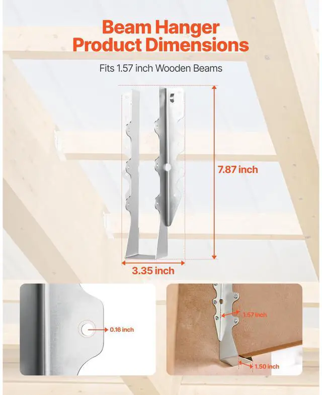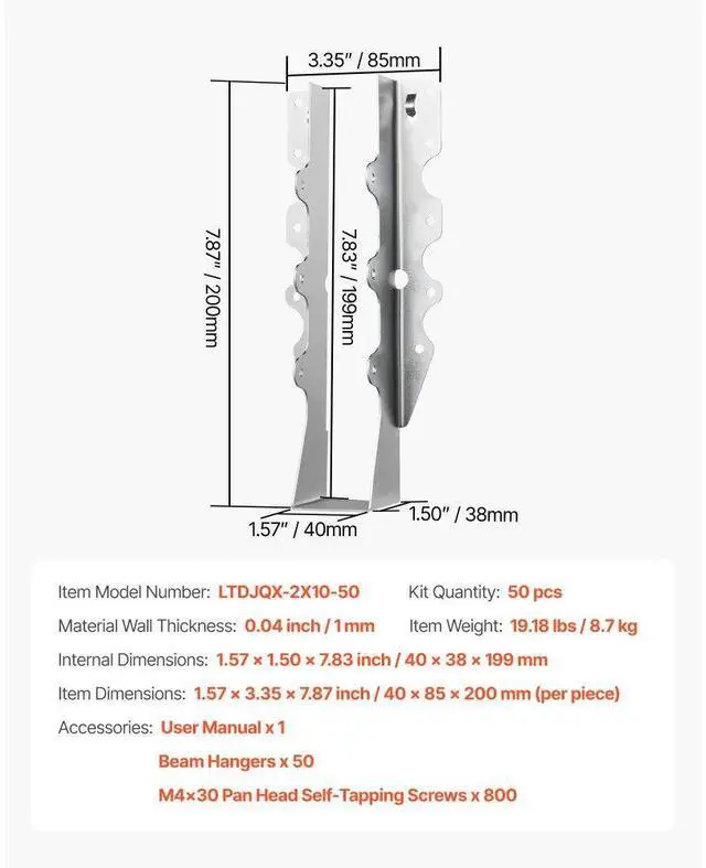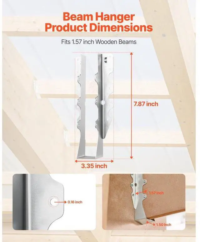 • Compatible Dimensions: This joist hanger fits 1.57 x 7.83 inch lumber and measures 1.57 x 3.35 x 7.87 inch, matching standard wood sizes for a snug, secure fit. Built from premium steel, it offers durable, long-term support for wood-frame structures like roofs, decks, ceilings, and floors