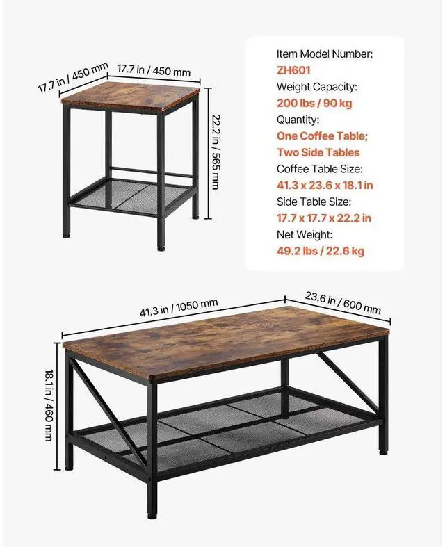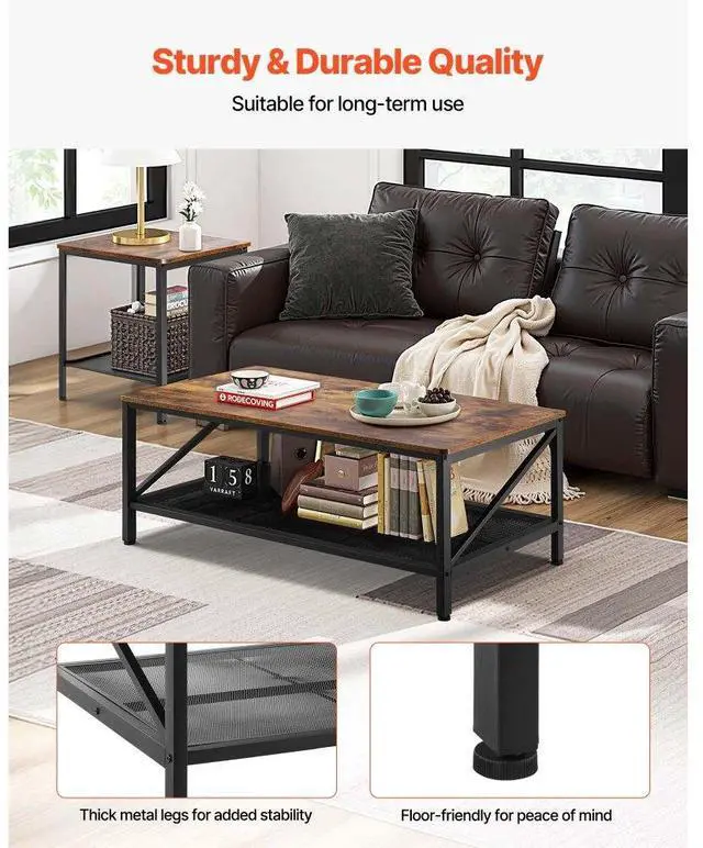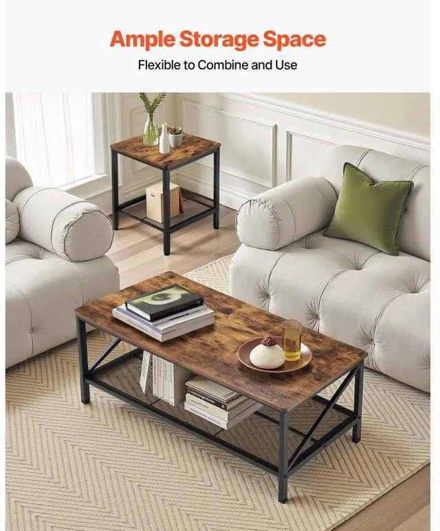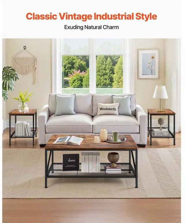 VEVOR 3 Pieces Living Room Table Sets, 41.3 in Industrial Coffee Table with 2 Square End Side Tables, Easy Assembly Coffee and End Tables Sets with Metal Legs, for Office, Living Room & Apartment Flexible Combination Vintage Atmosphere Sturdy Load-bearing Storage Space Multi-purpose Modular Layout for Space Optimization
