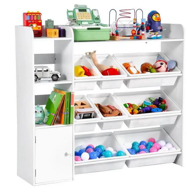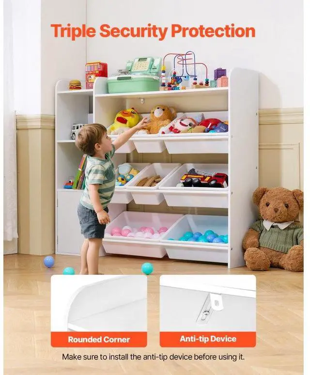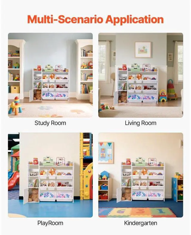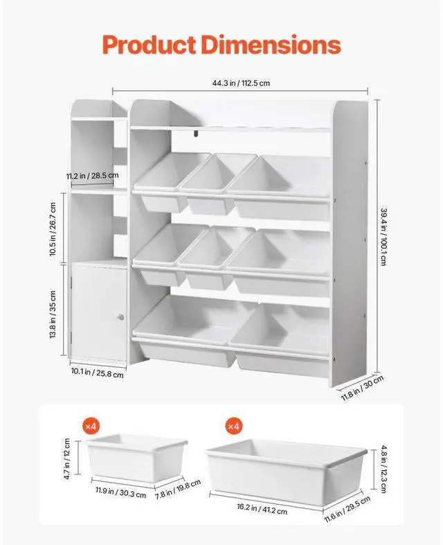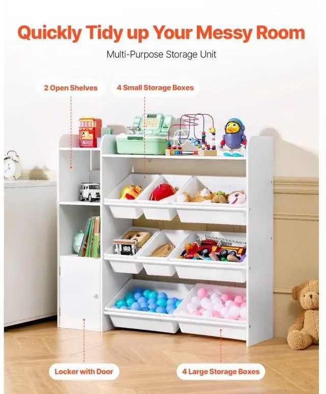 VEVOR Kids Toy Storage and Bookshelf, 4-Tier Toy Storage Organizer with 8 Flexible Plastic Bins, Kids Cubby Cabinet with Bookshelf for Study Room, Bedroom, Playroom, Classroom, Nursery, White Multi-Functional Storage Large Capacity Storage Secure Materials Anti-Tip Design Ideal for Any Room Great Present Ideal Components: 4 Small Storage Bins, 4 Large Storage Bins, 2 Bookshelves, 1 Storage Cabinet,