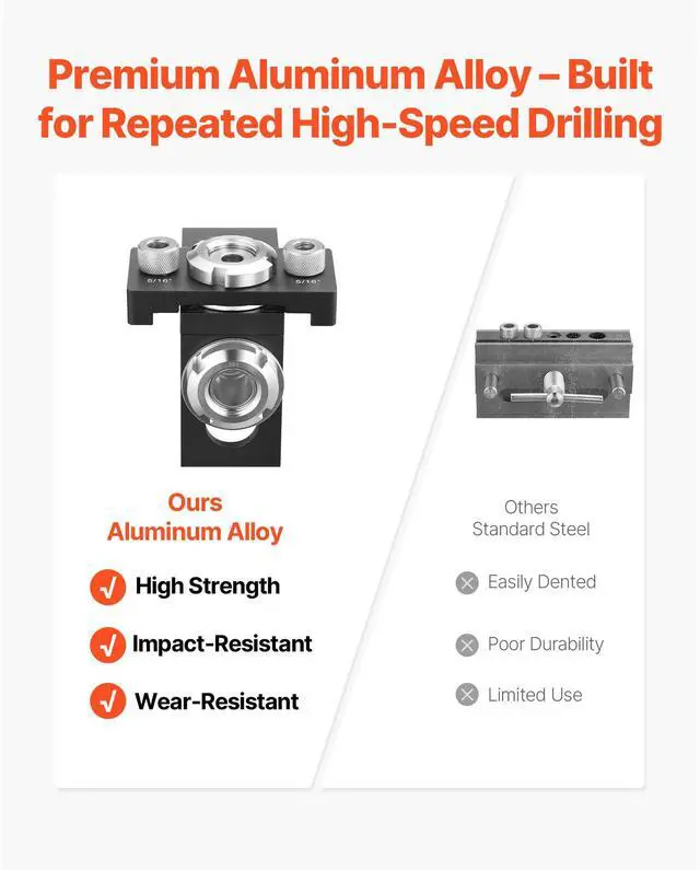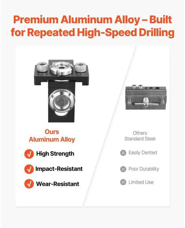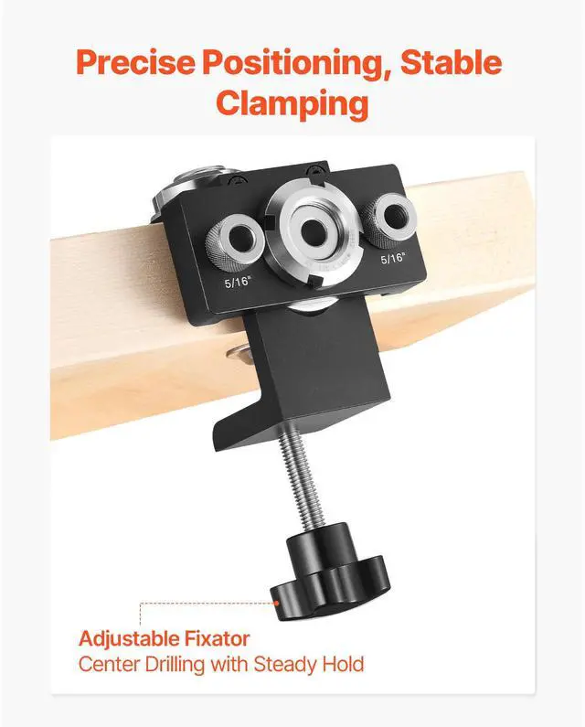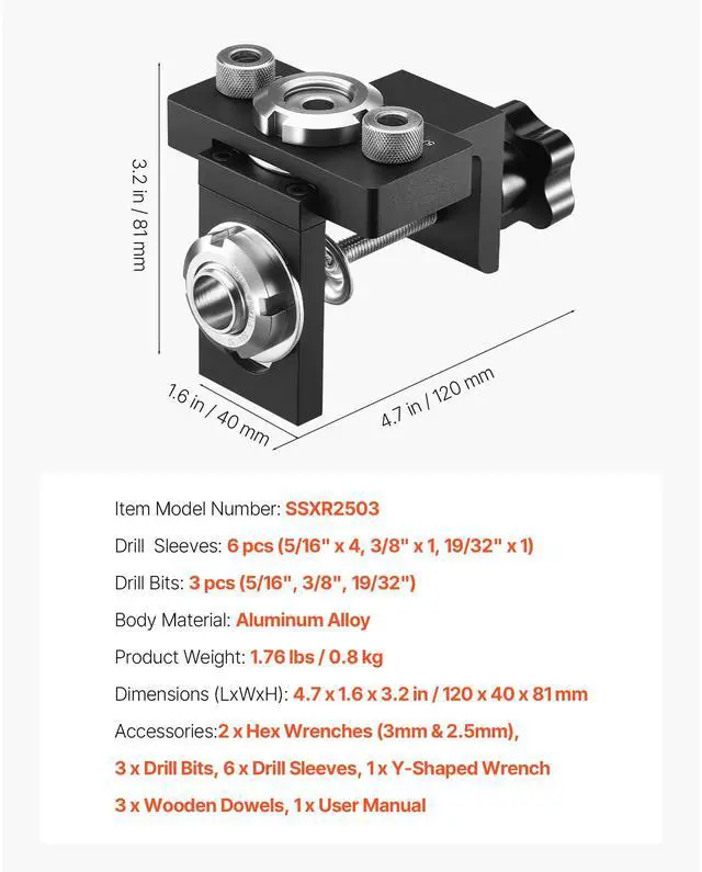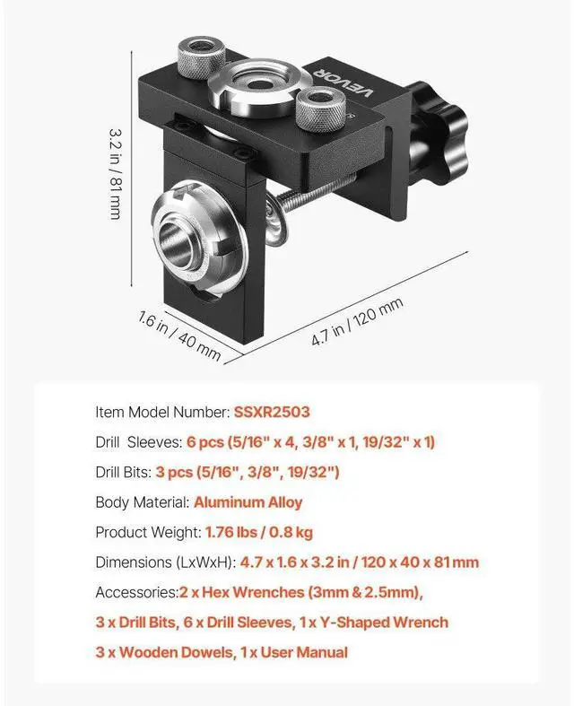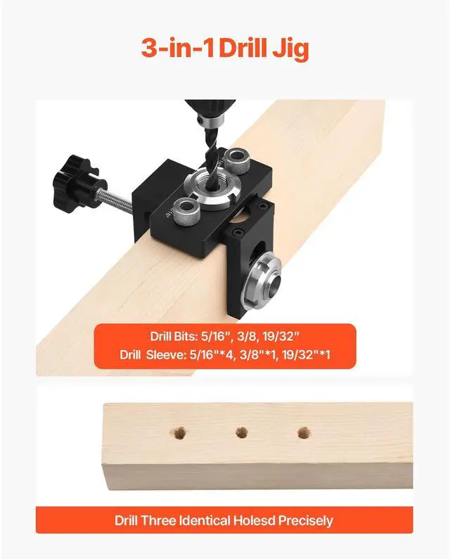 Doweling Jig Kit Self Centering Dowel Drill Jig with 3 Drill Bits Woodworking 3-in-1 Multi-Functional Tool Precise Hole Spacing Laser Marked Scales Easy to Use Wide Application High-Strength Build Drill Sleeves: 6 pcs (5/16" x 4, 3/8" x 1, 19/32" x 1),