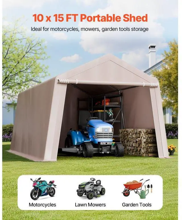 Outdoor Storage Shelter Portable Shed 10x15 ft Waterproof Canopy Garage Tent Roll-Up Door with Zippers Galvanized T-Connectors Galvanized Steel Column Quick Assembly Versatile Use PE Canopy