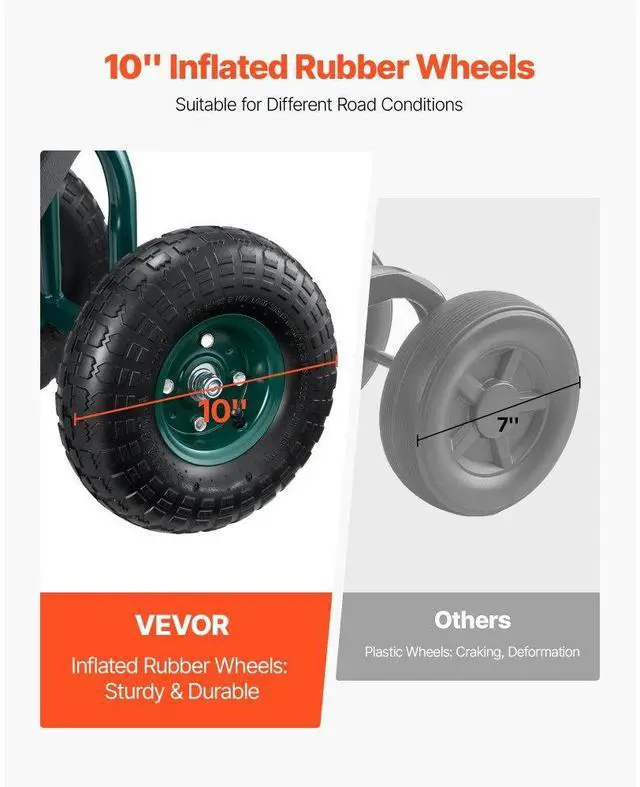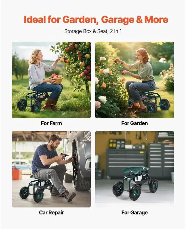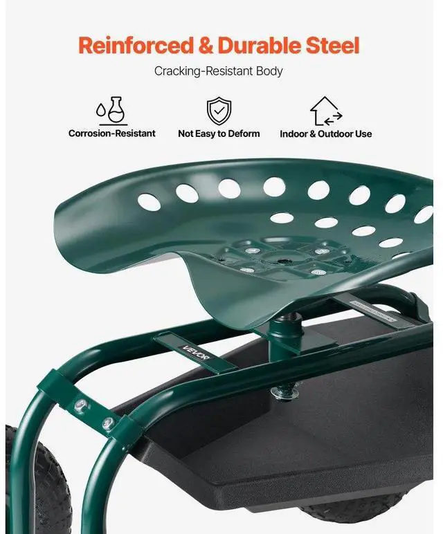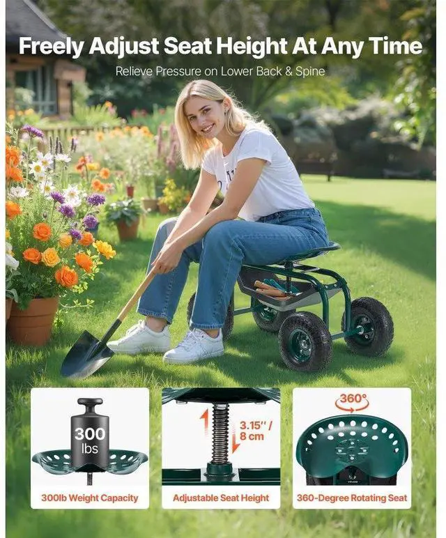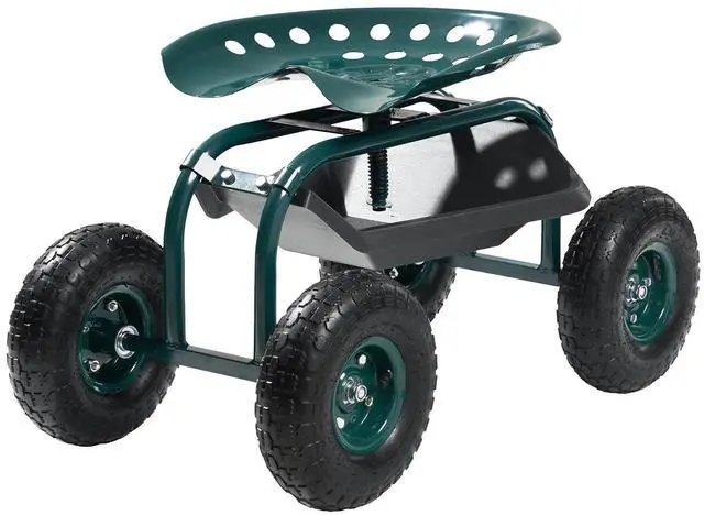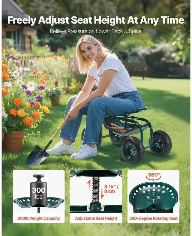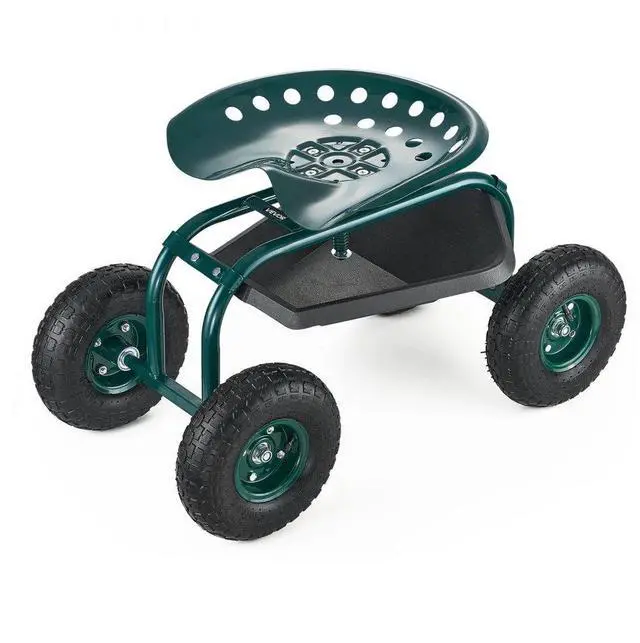 Outdoor Rolling Garden Cart with Swivel Seat All-Terrain Wheels Tool Tray 300lbs Ergonomic & Comfortable Seat Sturdy & Durable Frame Inflatable Rubber Wheel Versatile Use Thoughtful