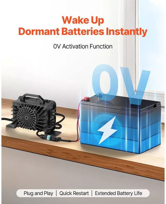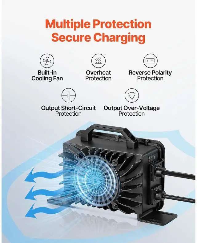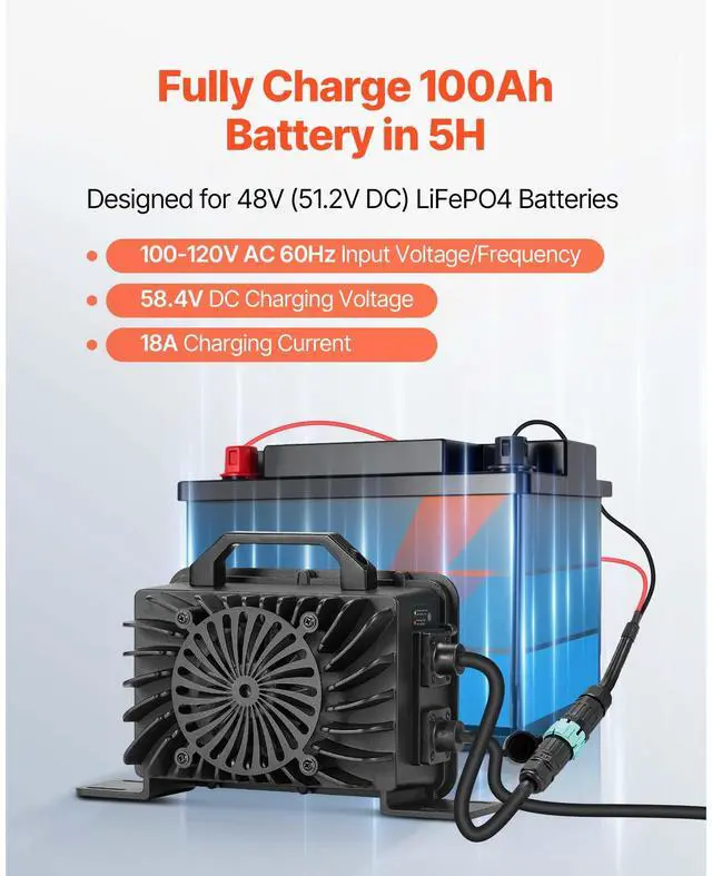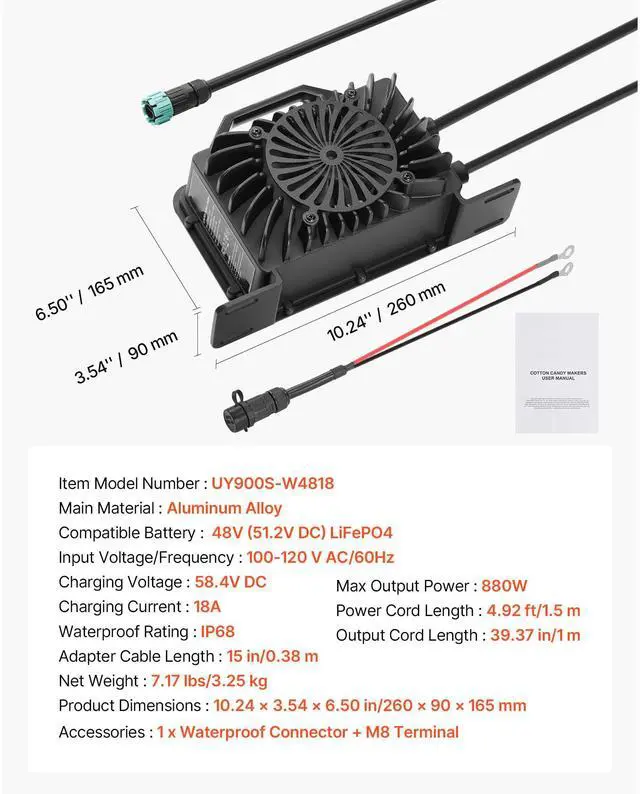 VEVOR 48V 18A Lithium Battery Charger 58.4V AC-DC LiFePO4 Smart Charger for RV DC Side AC Side Waterproof Connector+M8 Terminal Adapter Cable Multiple Security Protections Waterproof Connector Durable and Reliable