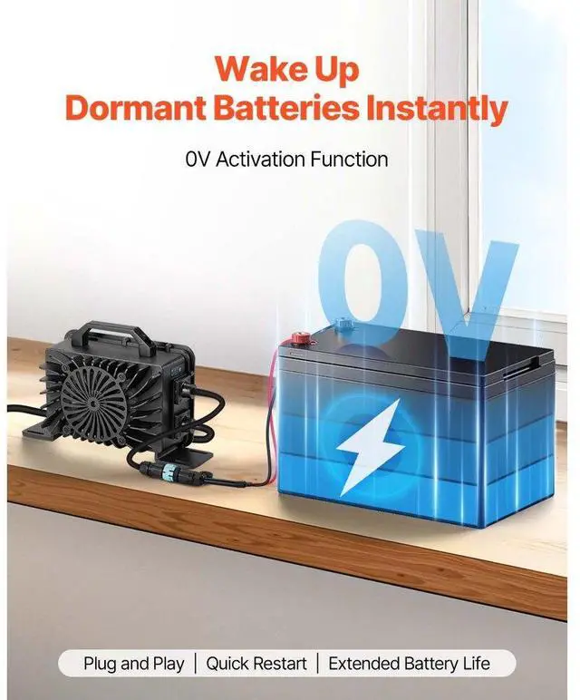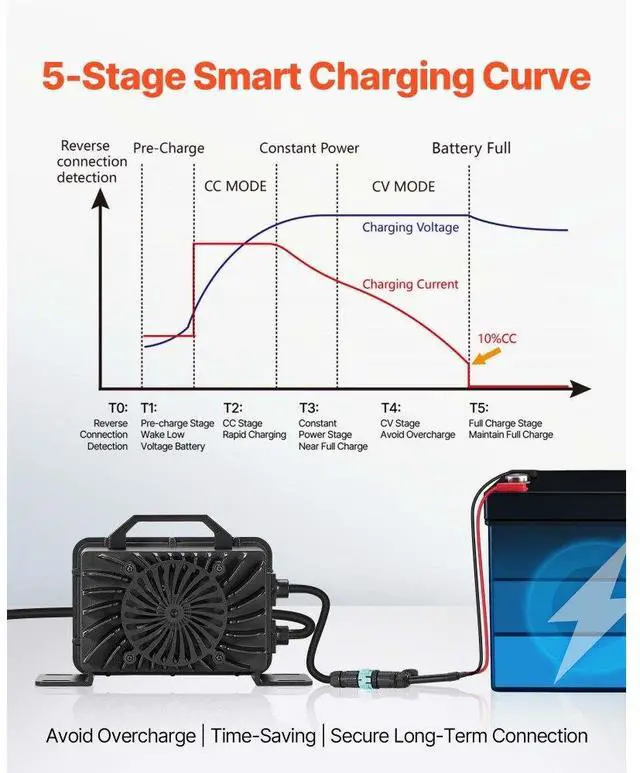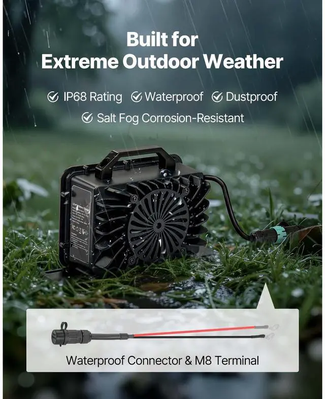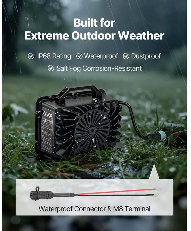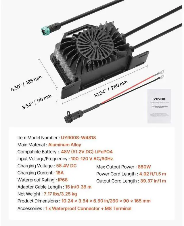 VEVOR 48V 18A Lithium Battery Charger 58.4V AC-DC LiFePO4 Smart Charger for RV DC Side AC Side Waterproof Connector+M8 Terminal Adapter Cable Multiple Security Protections Waterproof Connector Durable and Reliable