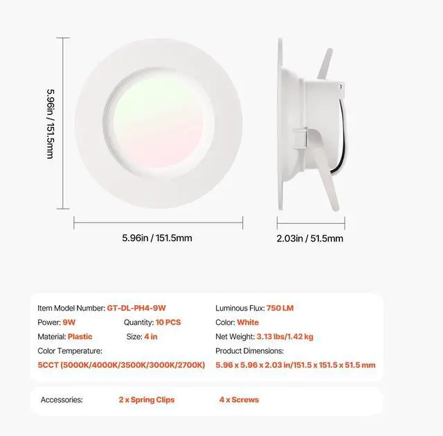 Design Color Temperature: 5CCT (5000K/4000K/3500K/3000K/2700K), Color: White, Item