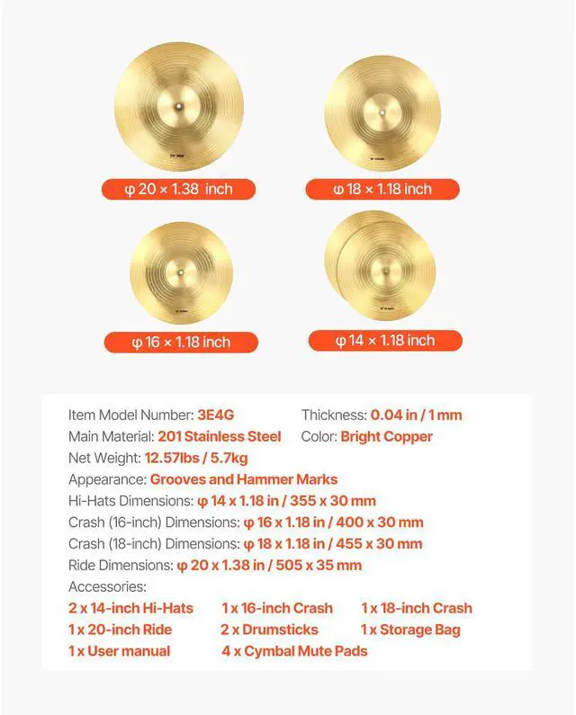 VEVOR Cymbal Pack 4 Pieces Cymbals Drum Set 14 16 18 20 Inches Cymbals for Drum Complete Cymbal Set 3 Sound Effects Comfortable Play Versatile Application Ideal Gift
