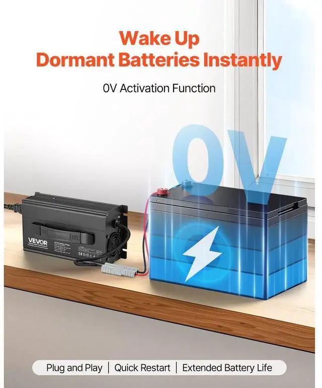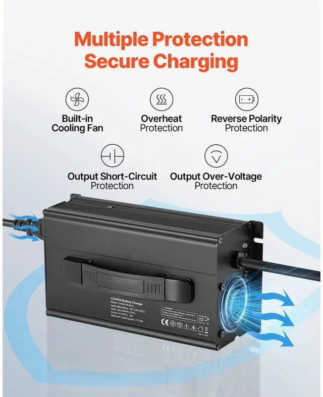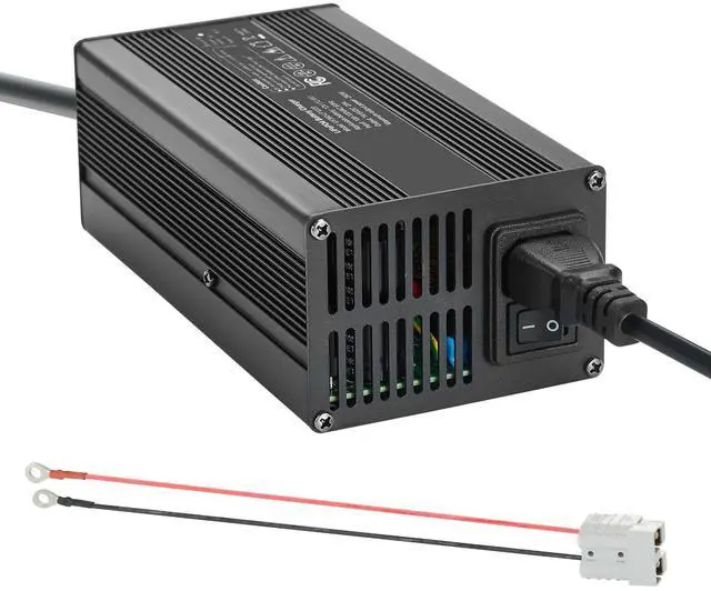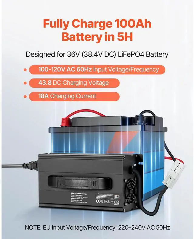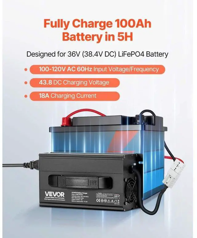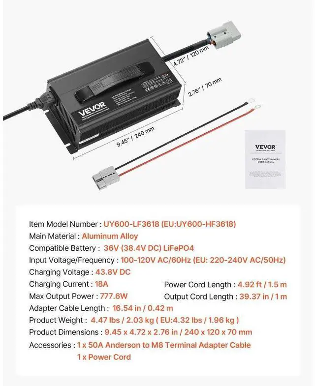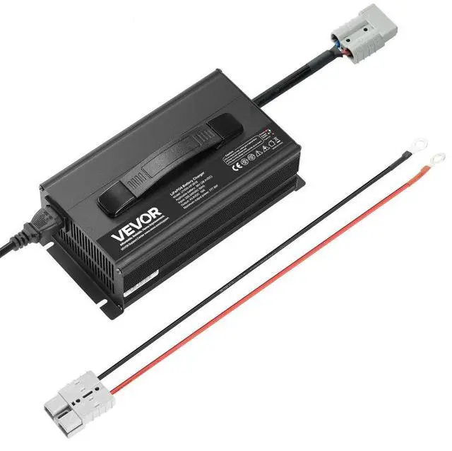 VEVOR 36V 18A Lithium Battery Charger 43.8V AC-DC LiFePO4 Smart Charger for RV DC Side AC Side Convenient Anderson Connector+M8 Terminal Adapter Cable Multiple Security Protections Convenient Anderson Connector Durable and Reliable
