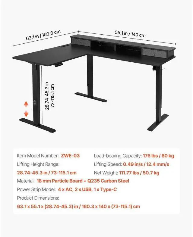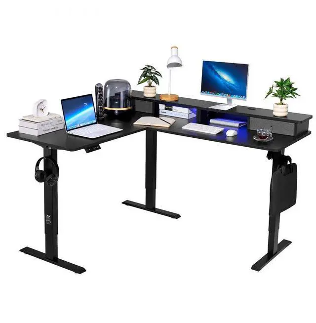 VEVOR L Shaped Desk Electric Adjustable Height Corner Gaming Desk w/ Light Strip Smart Height Adjustment Smooth Dual Motor Drive Smart Storage & Power Management Flexible L-Shaped Desk Ideal for Multiple Needs Easy Installation Lifting Speed: 0.49 in/s / 12.4 mm/s, Load-bearing