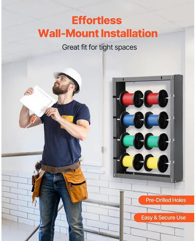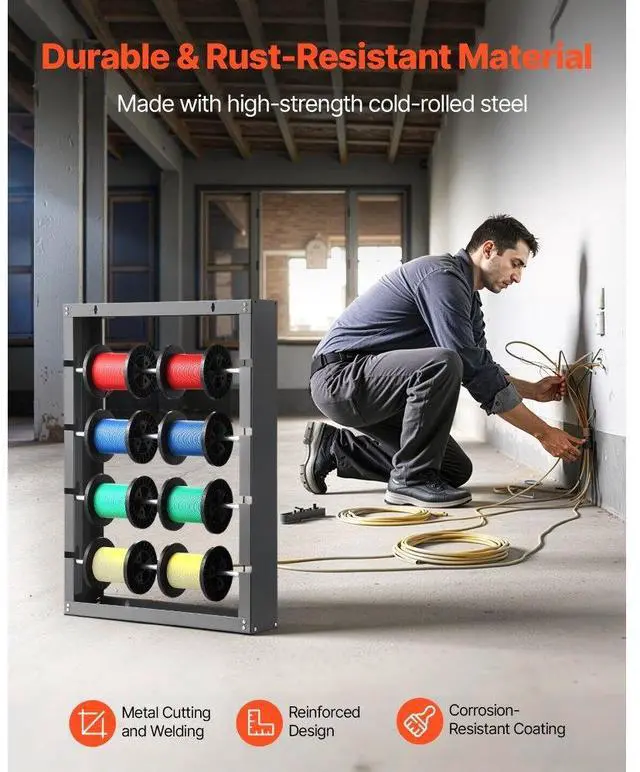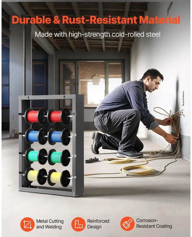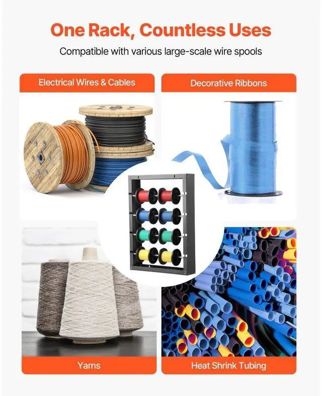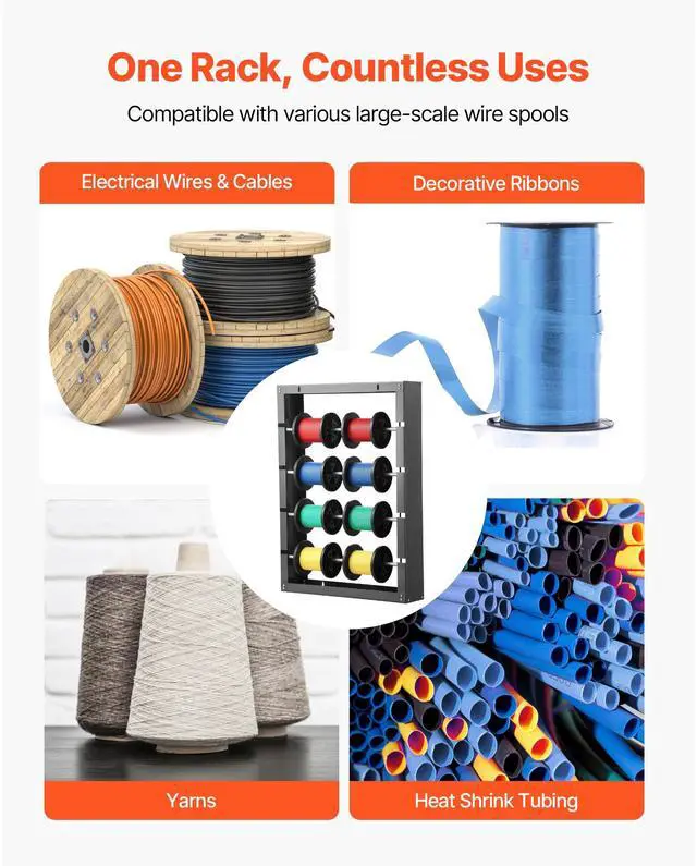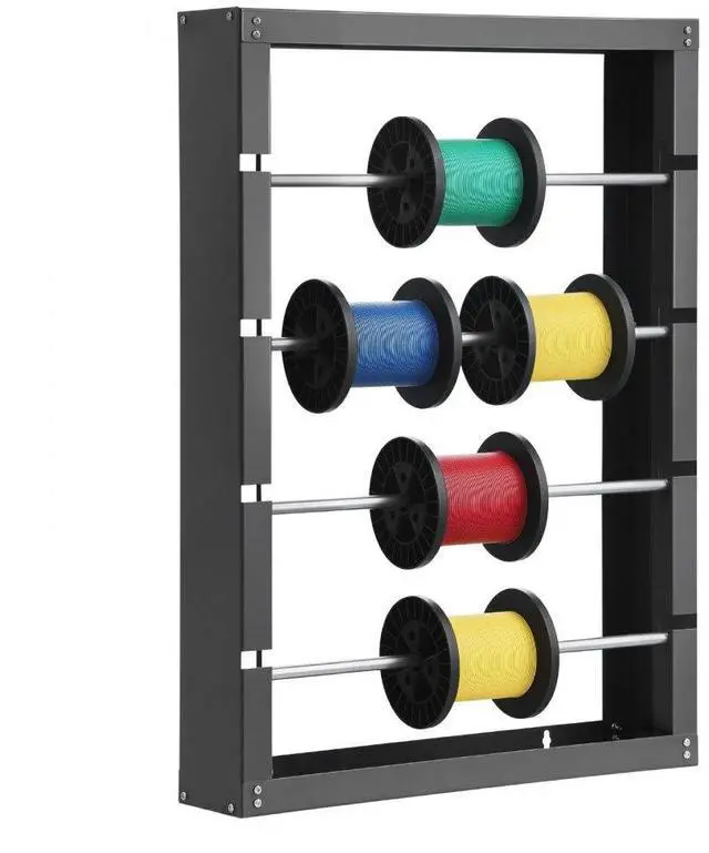 Wire Spool Rack 4 Adjustable Rods Spool Holder Wall Mounted 150 lbs Capacity Spacious & Space-Saving 4 Adjustable Rod Shafts Heavy-Duty & Reliable Keep Cables Neat & Tangle-Free Fast Assembly, Easy Use Quick Cable Swaps Made Easy Item