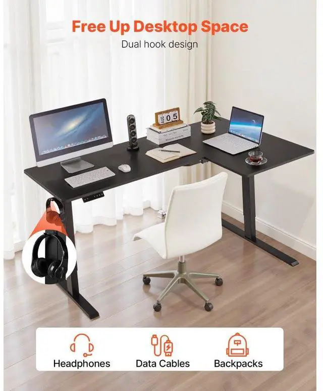 VEVOR L Shaped Desk Electric Adjustable Height Corner Gaming Desk with 2 Hooks Smart Height Adjustment Smooth Dual Motor Drive Efficient Cable & Storage Management Flexible L-Shaped Desk Ideal for Multiple Needs Easy Installation Lifting Speed: 0.57 in/s / 14.6 mm/s, Load-bearing