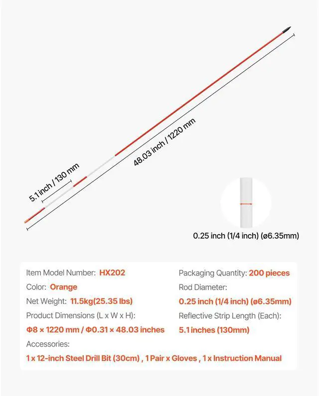 Rod Size: 6.35 × 1200 mm / 0.25 × 47.24 inches