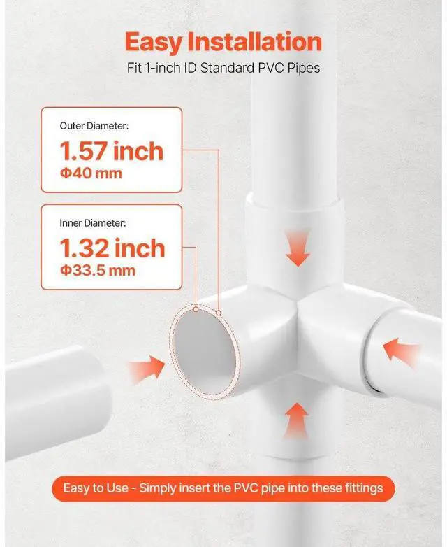 • Easy Installation: No tools required simply insert the PVC pipe into these fittings. Inner Diameter: 1.32 inch (33.5 mm), Outer Diameter: 1.57 inch (40 mm). Fits 1-inch ID standard PVC pipes