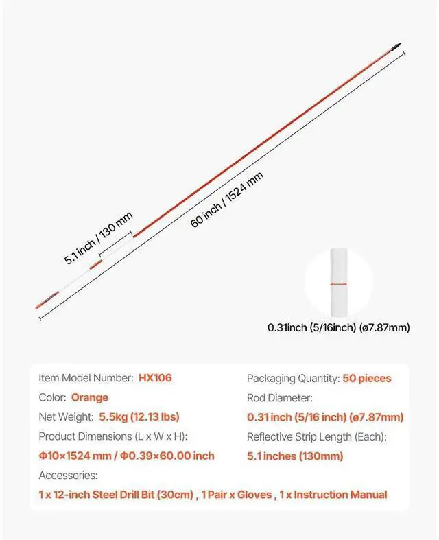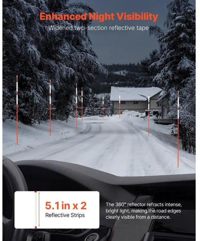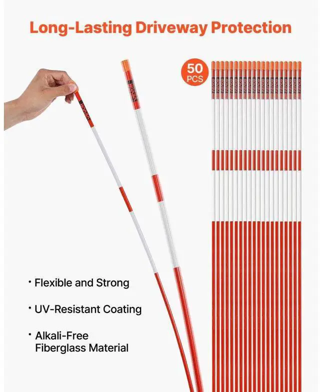 50Pcs Reflective Driveway Markers 5/16" Dia 60 in Snow Stakes Reflectors Orange Highly Flexible Pointed Tip Sturdy & Durable Weather-Resistant Performance Thoughtful Design Lightweight & Convenient Tapered Tip Material: PE, Rod