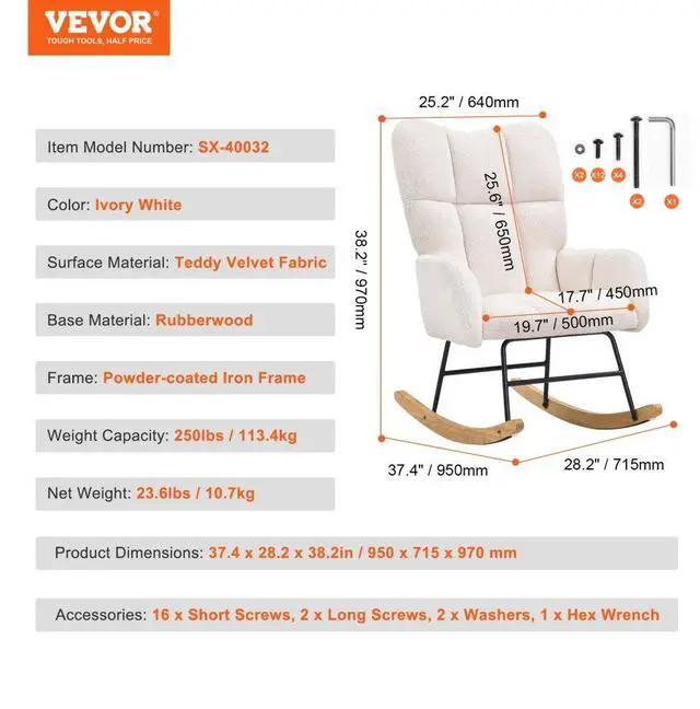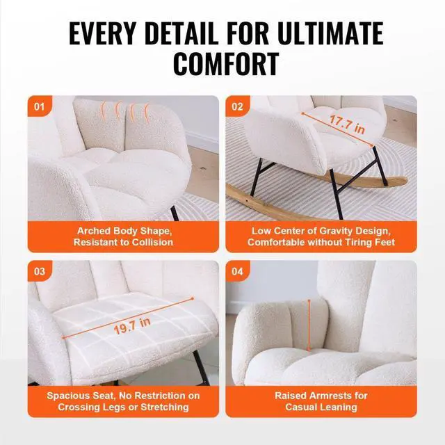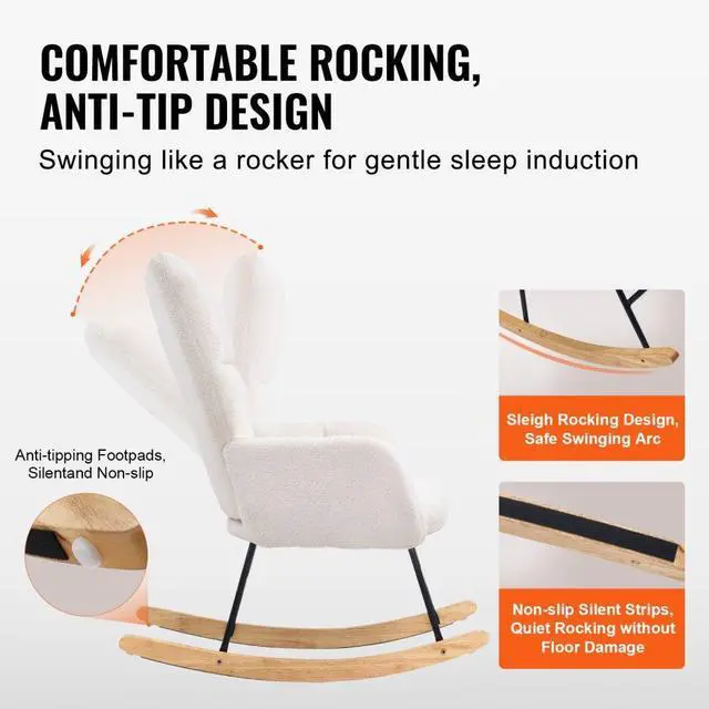 VEVOR Rocking Chair Nursery, Glider Rocking Chair with Soft Seat and High Backrest, Electric Chair 250 lbs Weight Capacity Teddy Fabric, Upholstered Glider Rocker Chair for Nursery, Bedroom, Living Room, Ivory White Single Seater Rocking Chair Soft Teddy Fabric Ergonomic Arc Design Clear Assembly Instructions Sleek Ivory White Design Exquisite