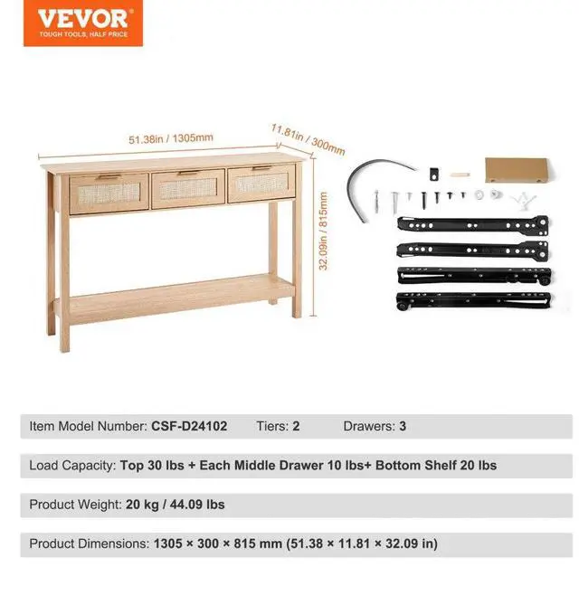 VEVOR Rattan Console Table with 3 Storage Drawers Rattan 51.38 x 11.81 x 32.09 inch Sliding Door Natural, Rattan Entryway Table with Storage, Small Console Tables for Entryway, Entry Table for Hallway, Living Room Table Natural Rattan Material Multifunctional Design Ample Storage Space Stable and Sturdy Convenient Assembly Versatile