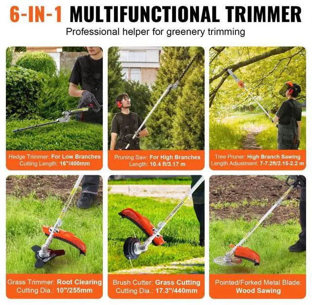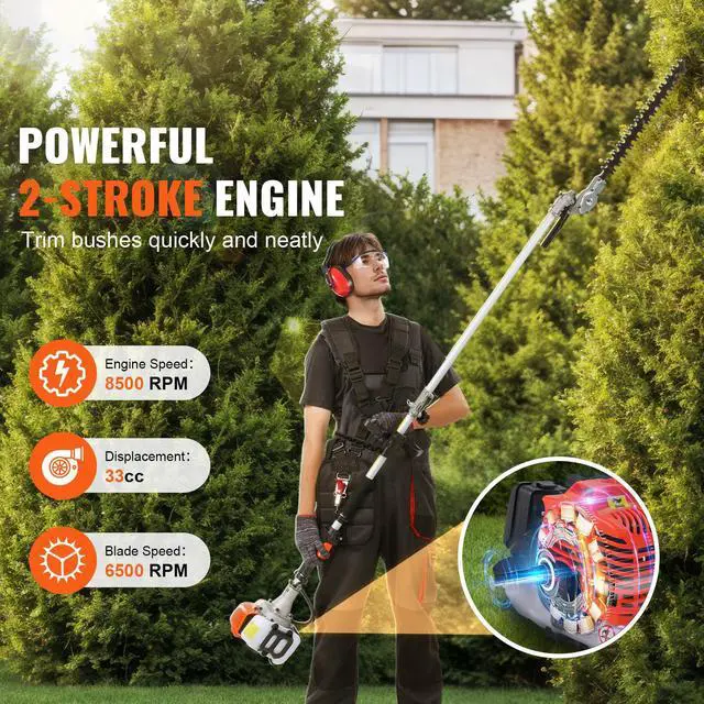 VEVOR 6-in-1 Multi-Functional Trimming Tools Gas Hedge Trimmer 33CC Weed Eater Comfortable Operation Long Runtime Easy Installation Durable Materials Effortless Assembly High-Performance Gas Bush Trimmer Main Materials: Aluminum/Iron/PA, Blade