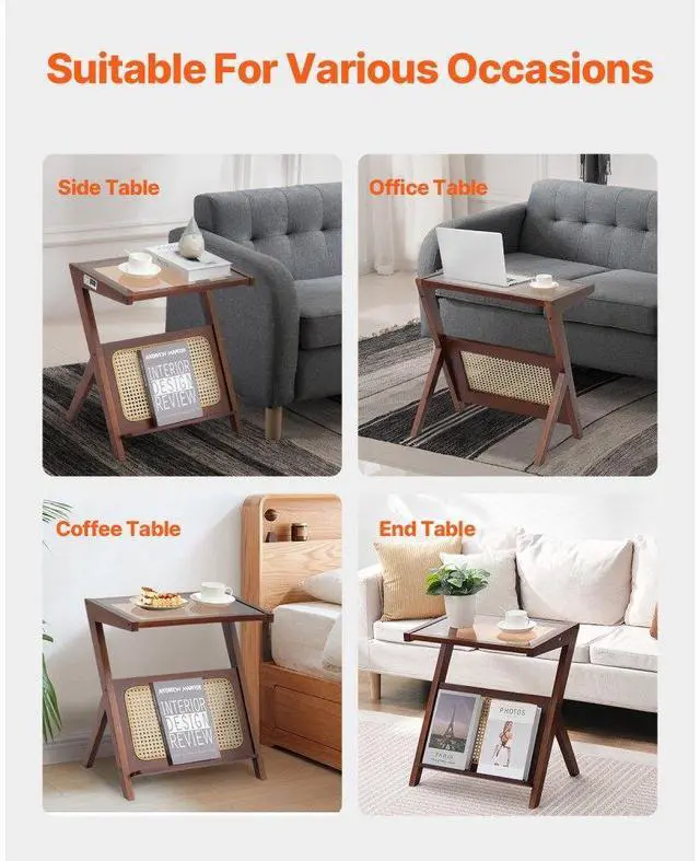 VEVOR Rattan Coffee Table, Z-Shaped Rattan Woven Bamboo End Table with Tempered Glass Top, 20 Modern Boho Storage Mid Century Coffee Table with Natural Bamboo Legs, for Living Room, Bedroom & Small Spaces, Walnut Rattan Coffee Table Premium Materials Ample Storage Easy Assembly Versatile Design Thoughtful Design Frame /